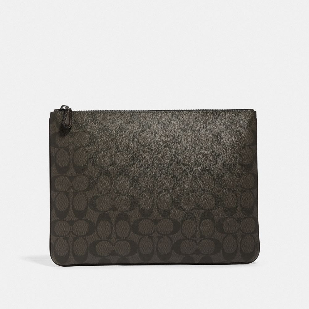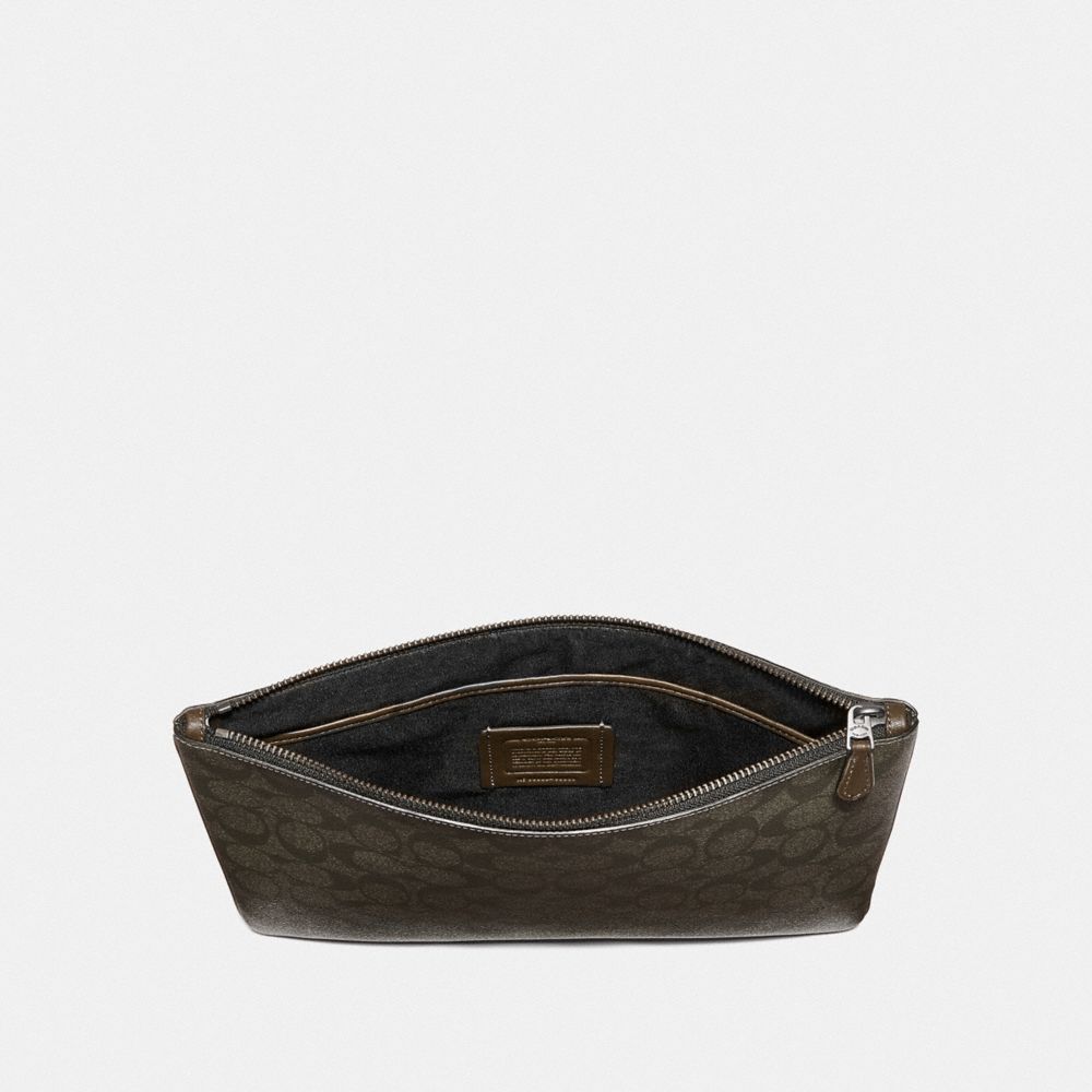 | Signature coated canvas with smooth leather details| Two credit card slots| Inside snap pocket| Zip-top closure, fabric lining| 11 3/4" (L) x 8 1/2" (H)