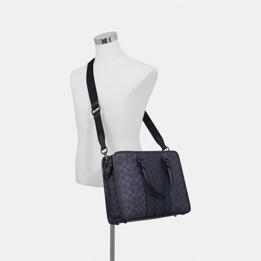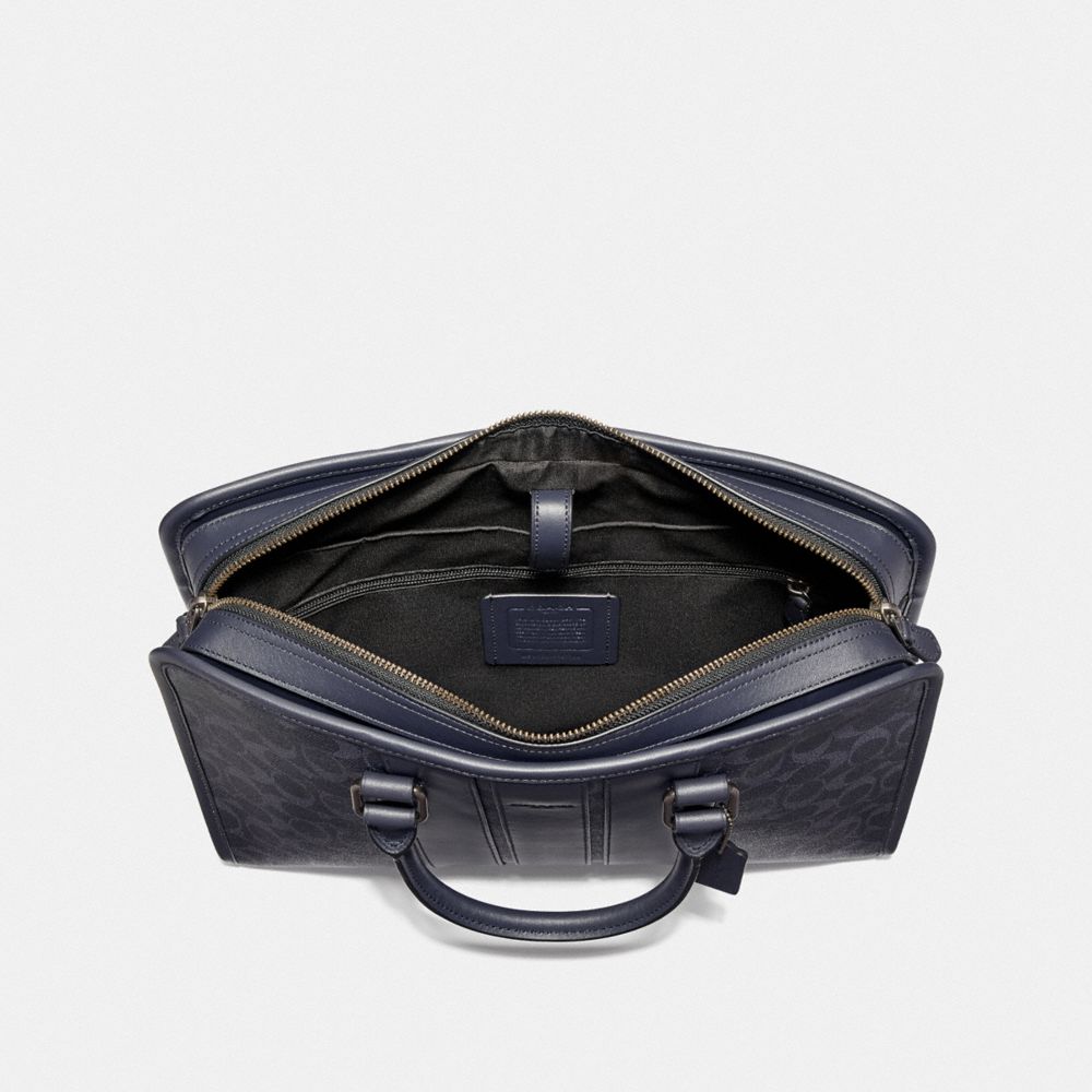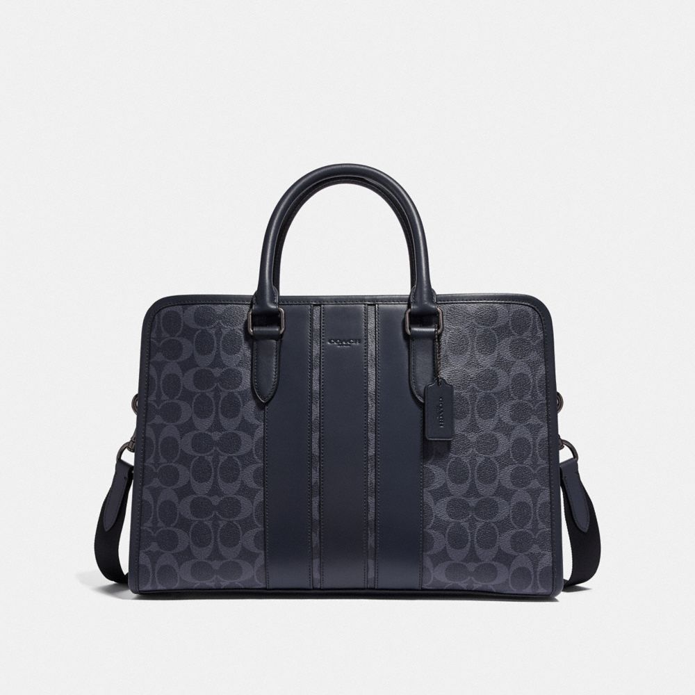 | Signature coated canvas and refined calf leather| Inside zip, cell phone and multifunction pockets| Inside laptop sleeve with secure tab| Zip-top closure, fabric lining| Handles with 5" drop| Outside magnetic snap pockets| Detachable strap with 53" drop for shoulder or crossbody wear| 16 1/4" (L) x 17" (H) x 5" (W)