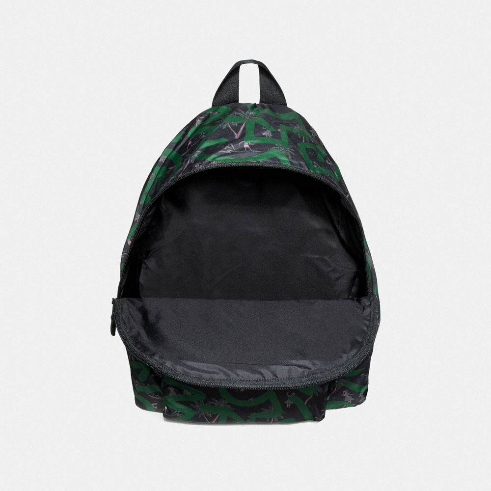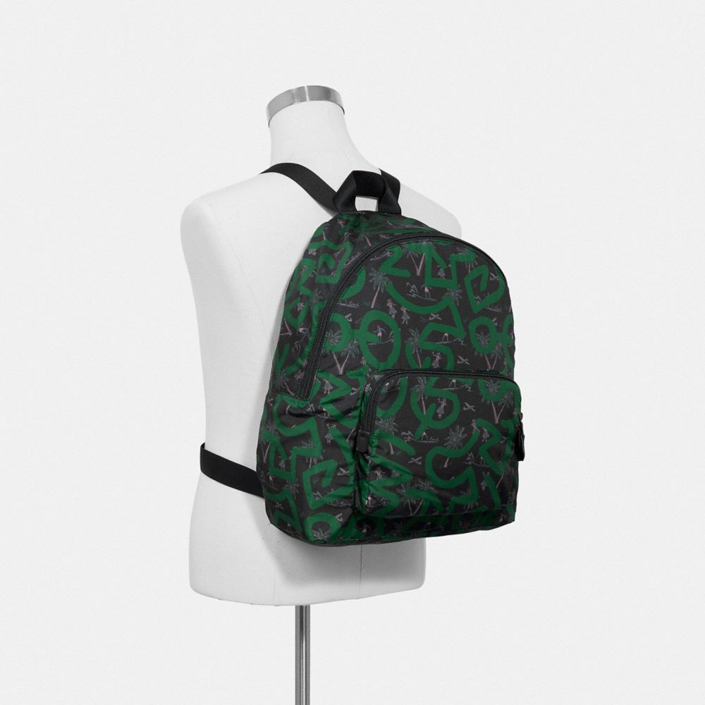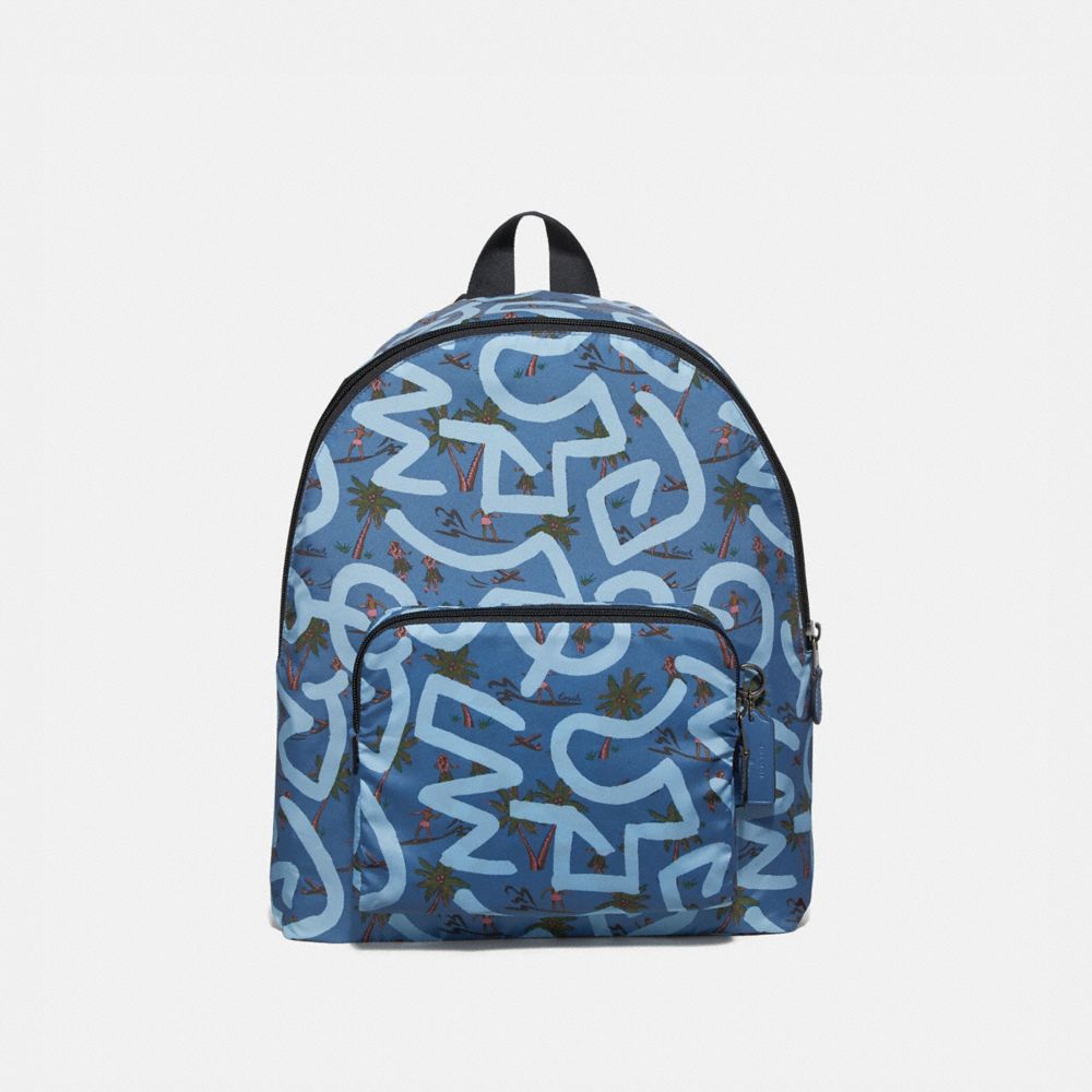| Nylon| Zip closure| Top handle with 2 1/2" drop| Outside zip pocket| Adjustable shoulder straps| 12" (L) x 15" (H) x 5 1/4" (W)| Backpack folds into zip pocket| Coach x Keith Haring collection| © Keith Haring Foundation. Licensed by Artestar, New York.