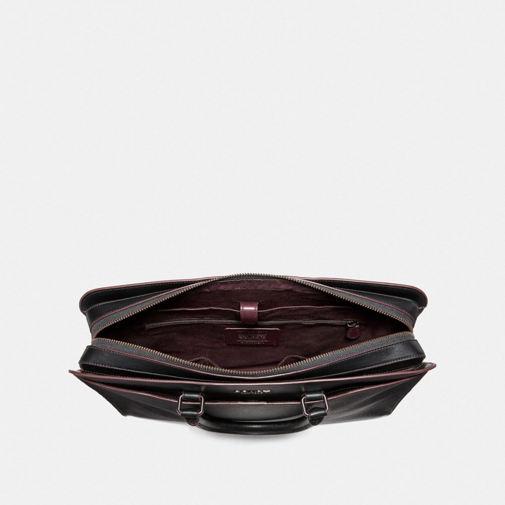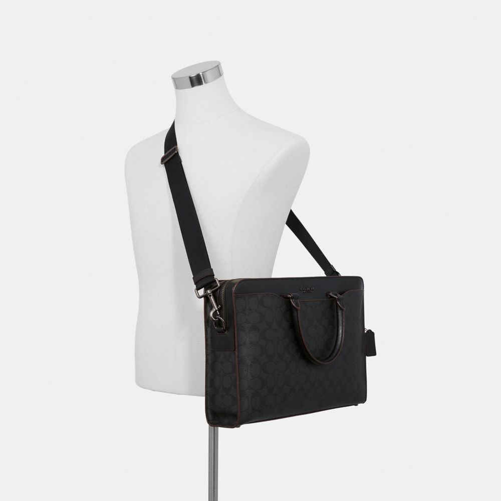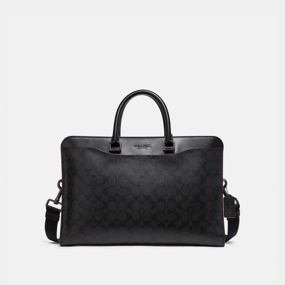 Signature coated canvas and refined calf leather| Inside zip, cell phone and multifunction pockets| Inside laptop sleeve with secure tab| Zip closure, fabric lining| Handles with 5" drop| Outside magnetic snap pockets| Detachable strap with 53" drop for shoulder or crossbody wear| 16 1/4" (L) x 17" (H) x 5" (W)