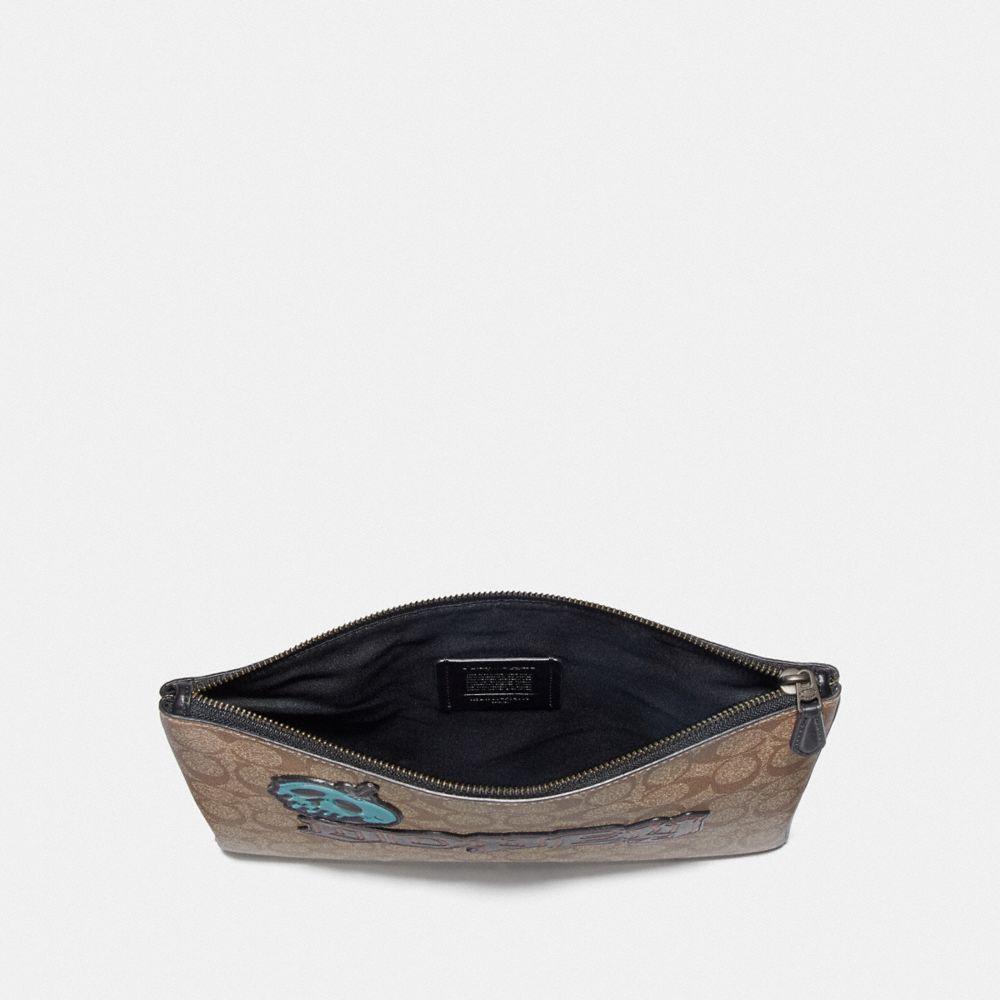 Signature coated canvas with refined calf leather details| Two credit card slots| Inside snap pocket| Zip-top closure, fabric lining| 11 3/4" (L) x 8 1/2" (H)| Disney x Coach | ©Disney