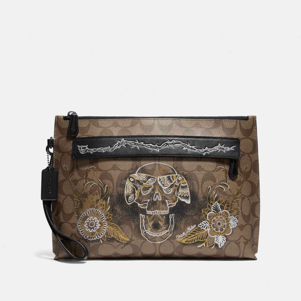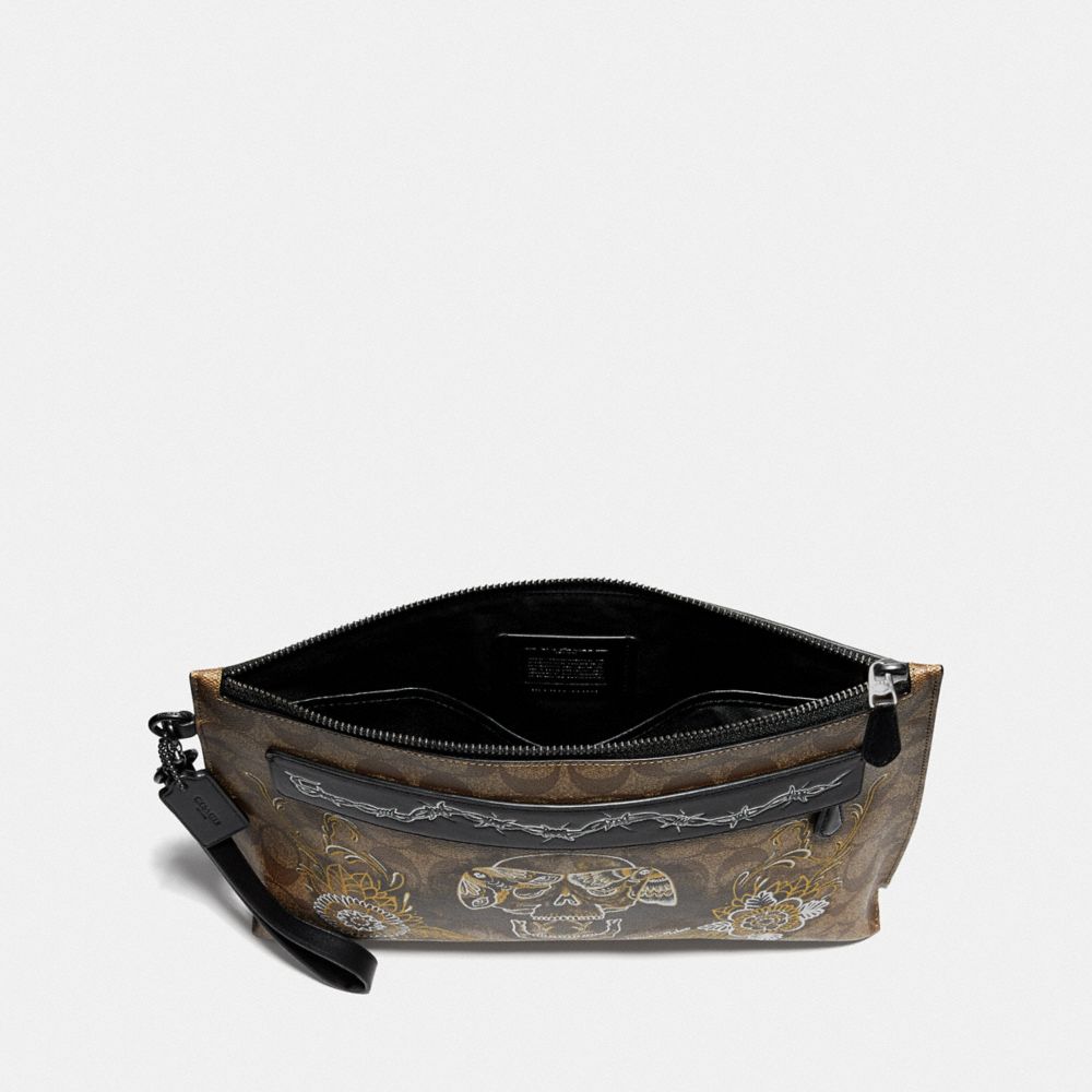Signature coated canvas and refined calf leather| Inside multifunction pocket| Zip-top closure, fabric lining| Outside zip pocket| Detachable wrist strap| 11 1/2" (L) x 8 1/4" (H) x 2 1/4" (W)| Featuring graphics created exclusively for Coach by tattoo artist Chelsea Champlain