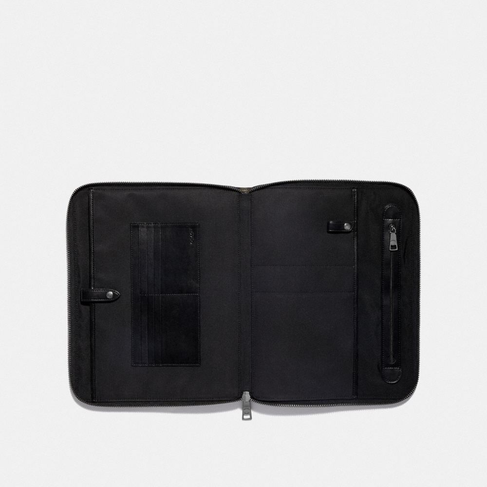 Printed coated canvas with refined calf leather details| Eight credit card slots| Inside slip and zip pockets| Inside tech sleeve with secure tab| Wire organizer snap tab| Zip-around closure| Outside slip pocket| 11 1/4" (L) x 8 3/4" (H)