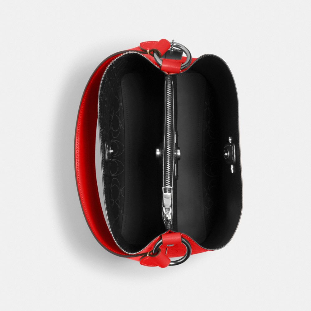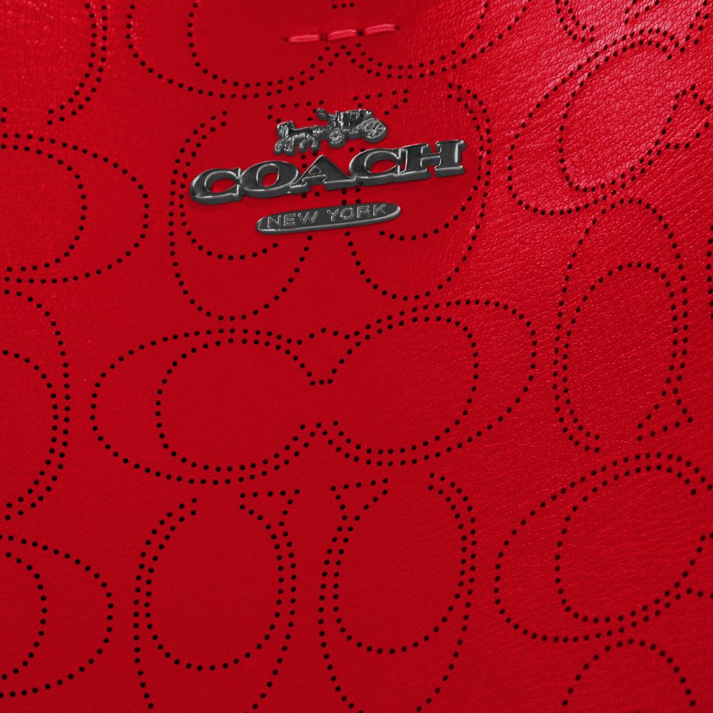 Signature perforated leather and smooth leather| Center zip compartment| Snap closure, fabric lining| Handle with 8" drop| Detachable strap with 20 1/2" drop for shoulder or crossbody wear| 10 1/4" (L) x 10" (H) x 5" (W)