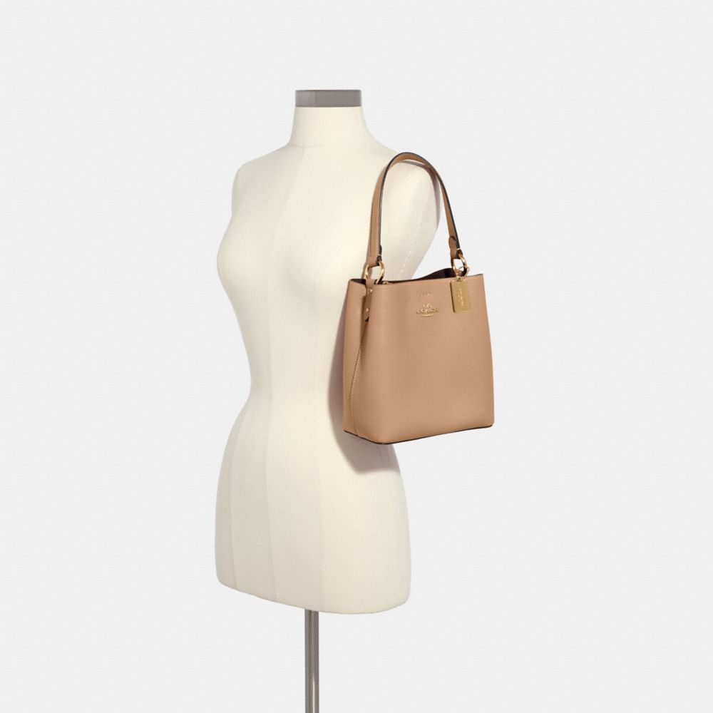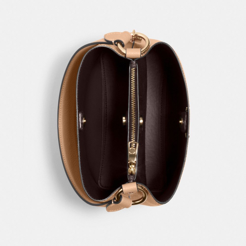 Polished pebble leather| Center zip compartment| Snap closure| Handle with 6 3/4" drop| Detachable strap with 22" drop for shoulder or crossbody wear| 8 1/2" (L) x 8 3/4" (H) x 4" (W)