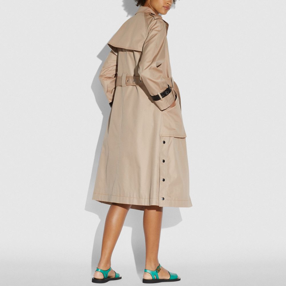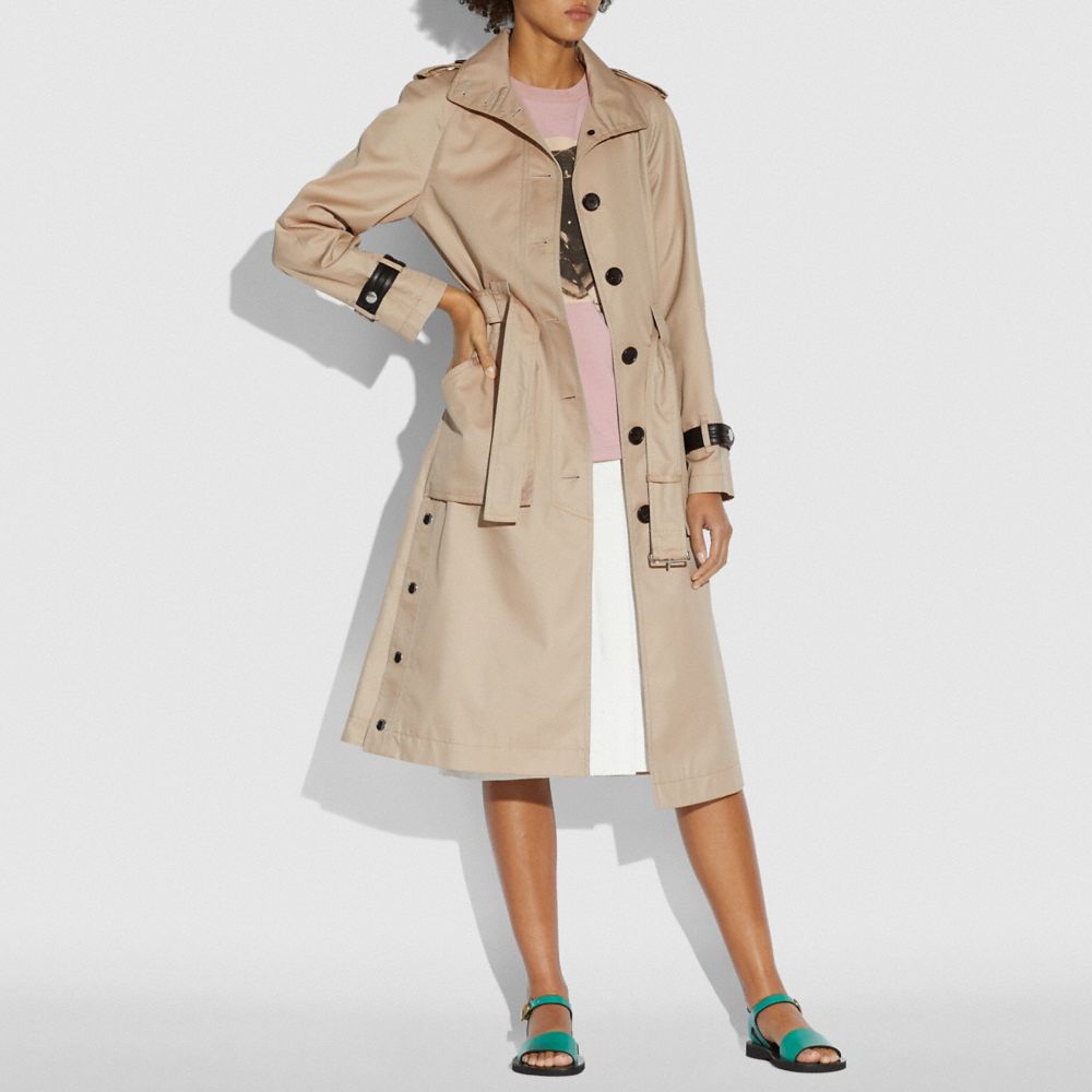 68% cotton, 32% polyester| Lining: 100% polyester| Leather details| Button closure| Slip pockets| Adjustable belt at waist| Water-resistant| Length: 45"| Dry clean | Model is 5'10" (178cm), chest 31" (79cm), waist 24" (61cm), hips 35" (89cm) and wears a size 2