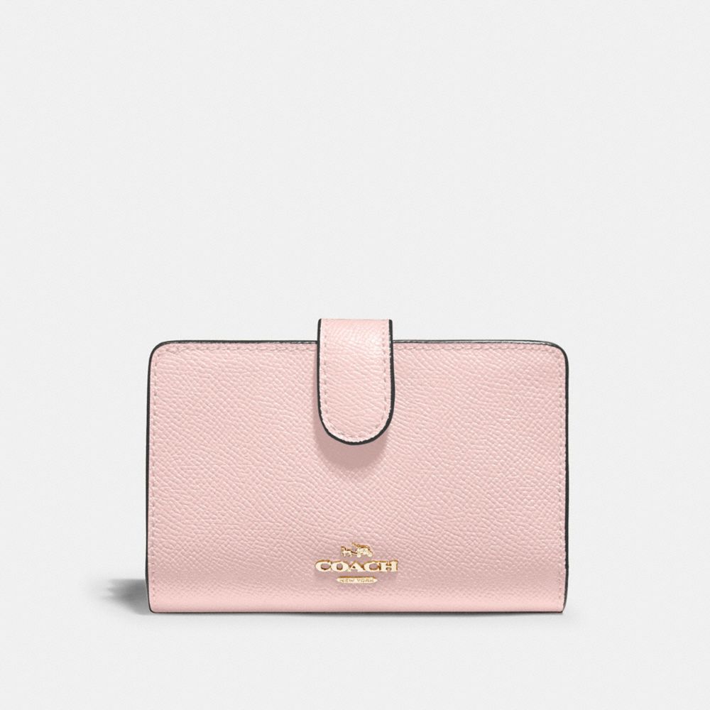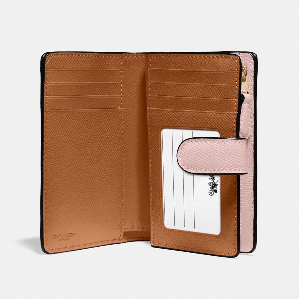 Crossgrain leather| Seven credit card slots| Bill compartment| ID window| Zip pocket| Snap closure| 5" (L) x 3 1/2" (H) x 1/2" (W)