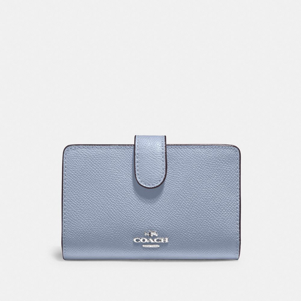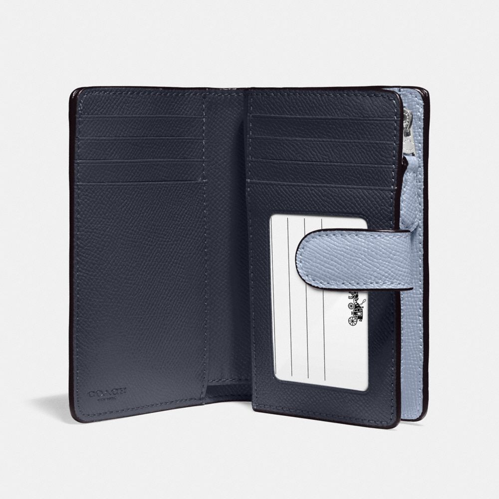 Crossgrain leather| Seven credit card slots| Bill compartment| ID window| Zip pocket| Snap closure| 5" (L) x 3 1/2" (H) x 1/2" (W)