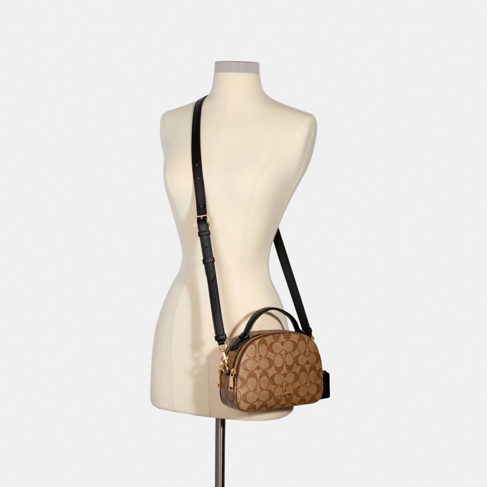 Signature coated canvas and smooth leather| Inside multifunction pocket| Double zip closure, fabric lining| Handle with 2" drop| Outside slip pocket| Detachable strap with 21" drop for shoulder or crossbody wear| 8 1/4" (L) x 5 3/4" (H) x 2 1/2" (W)