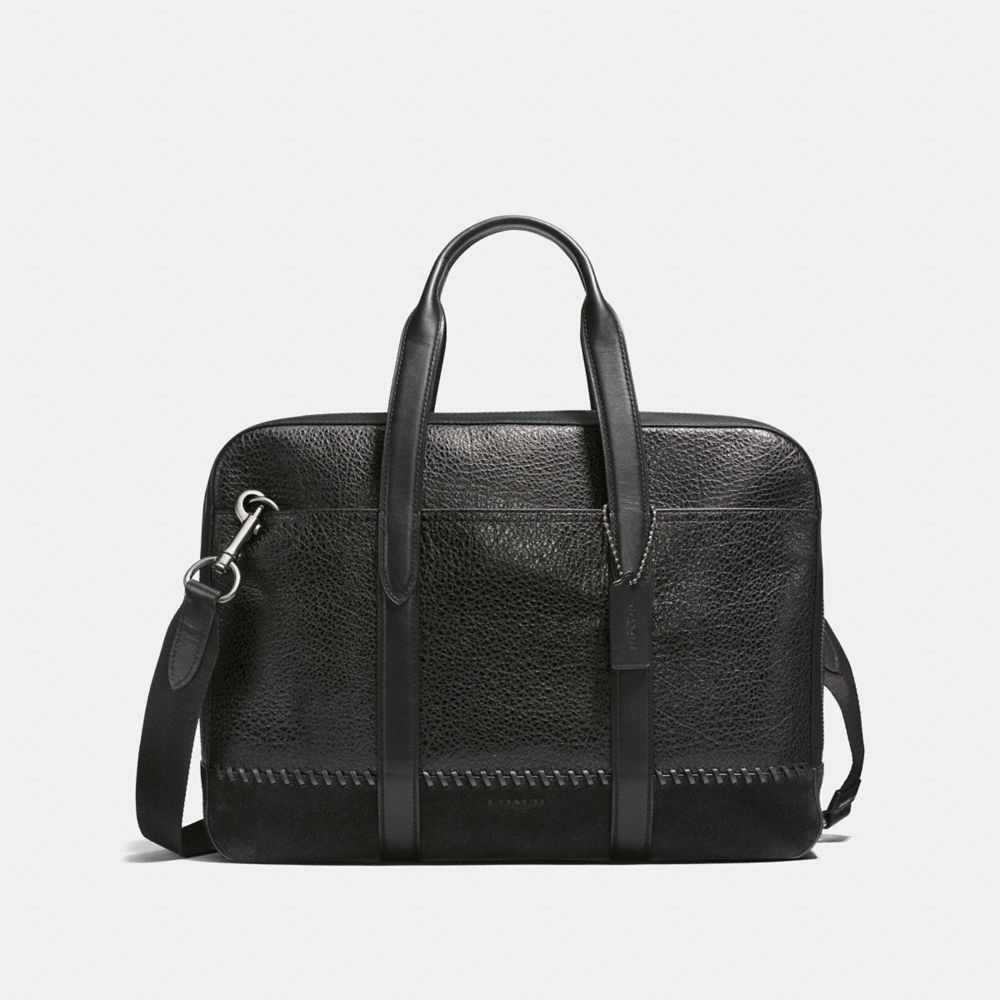Buffalo-embossed leather with suede details| Inside zip and multifunction pockets| Inside sleeve with secure tab for a 15" laptop| Zip-top closure, fabric lining| Handles with 5" drop| Two outside slip pockets with magnetic snap closures| Detachable nylon strap with 53" drop for shoulder or crossbody wear| 15 1/2" (L) x 11 1/4" (H) x 2 3/4" (W)