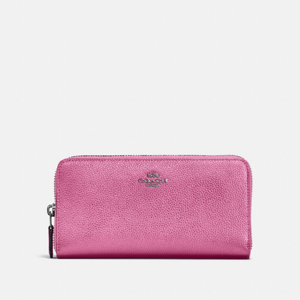 Metallic polished pebble leather| 12 credit card slots| Full-length bill compartments| Zip coin pocket| Zip-around closure| Outside open pocket| 7 1/2" (L) x 4" (H) x 3/4" (W)| Fits all phone sizes up to an iPhone X and Samsung S7 Edge