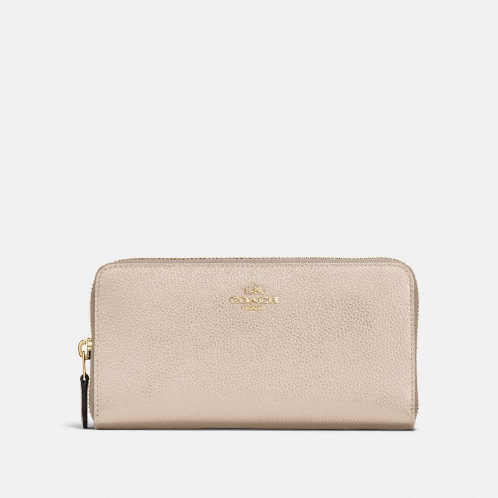 Metallic polished pebble leather| 12 credit card slots| Full-length bill compartments| Zip coin pocket| Zip-around closure| Outside open pocket| 7 1/2" (L) x 4" (H) x 3/4" (W)| Fits all phone sizes up to an iPhone X and Samsung S7 Edge
