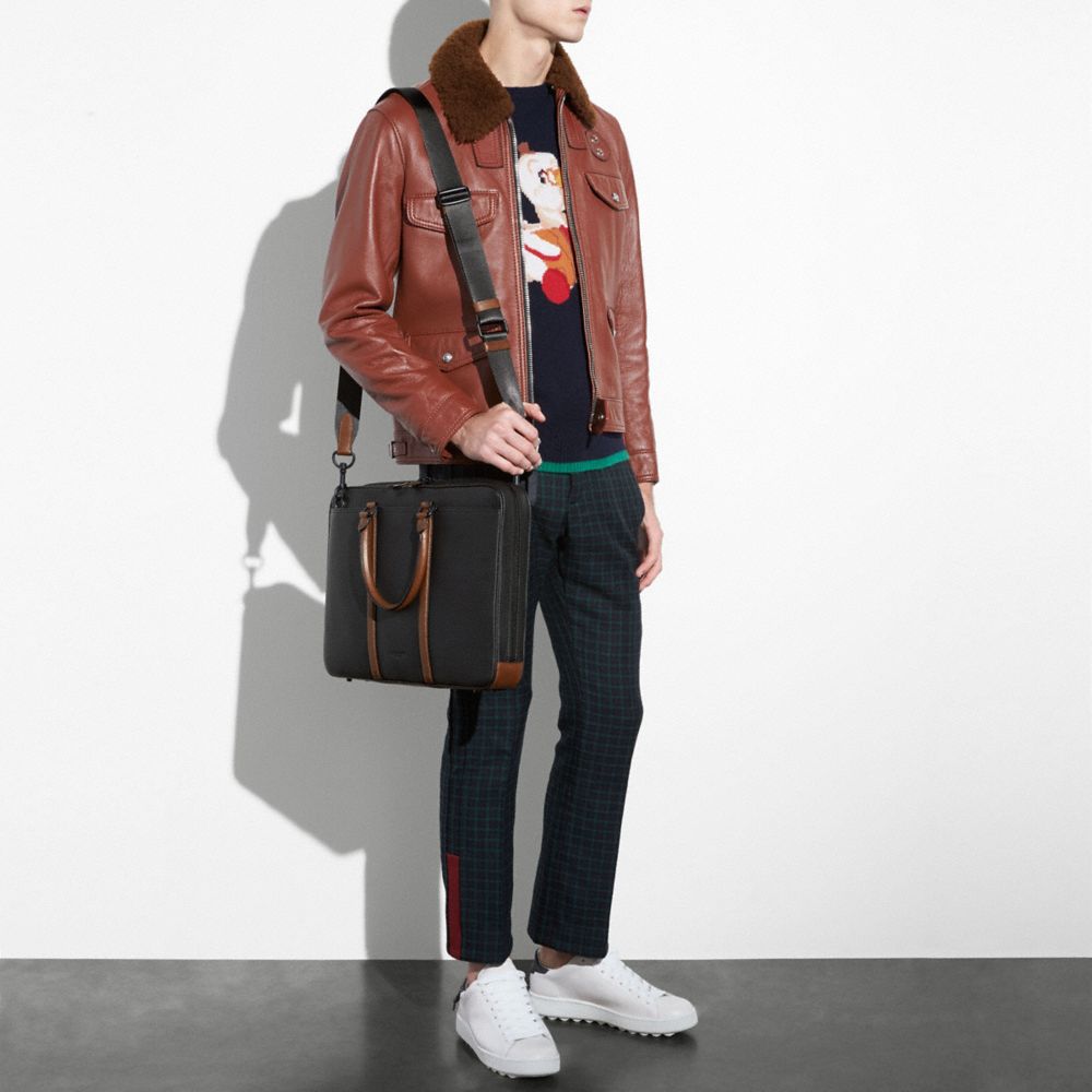 Pebble leather| Inside zip, cell phone and multifunction pockets| Inside sleeve with secure tab for a 15" laptop| Zip-around two-way closure| Fabric lining| Two exterior slip pockets with magnetic snap closures| Handles with 4 1/4" drop | Detachable nylon strap with 53 1/4" drop for shoulder or crossbody wear| 15 3/4" (L) x 11 3/4" (H) x 2 1/4" (W)