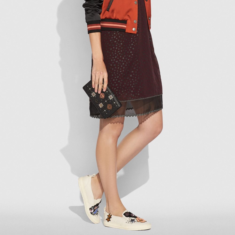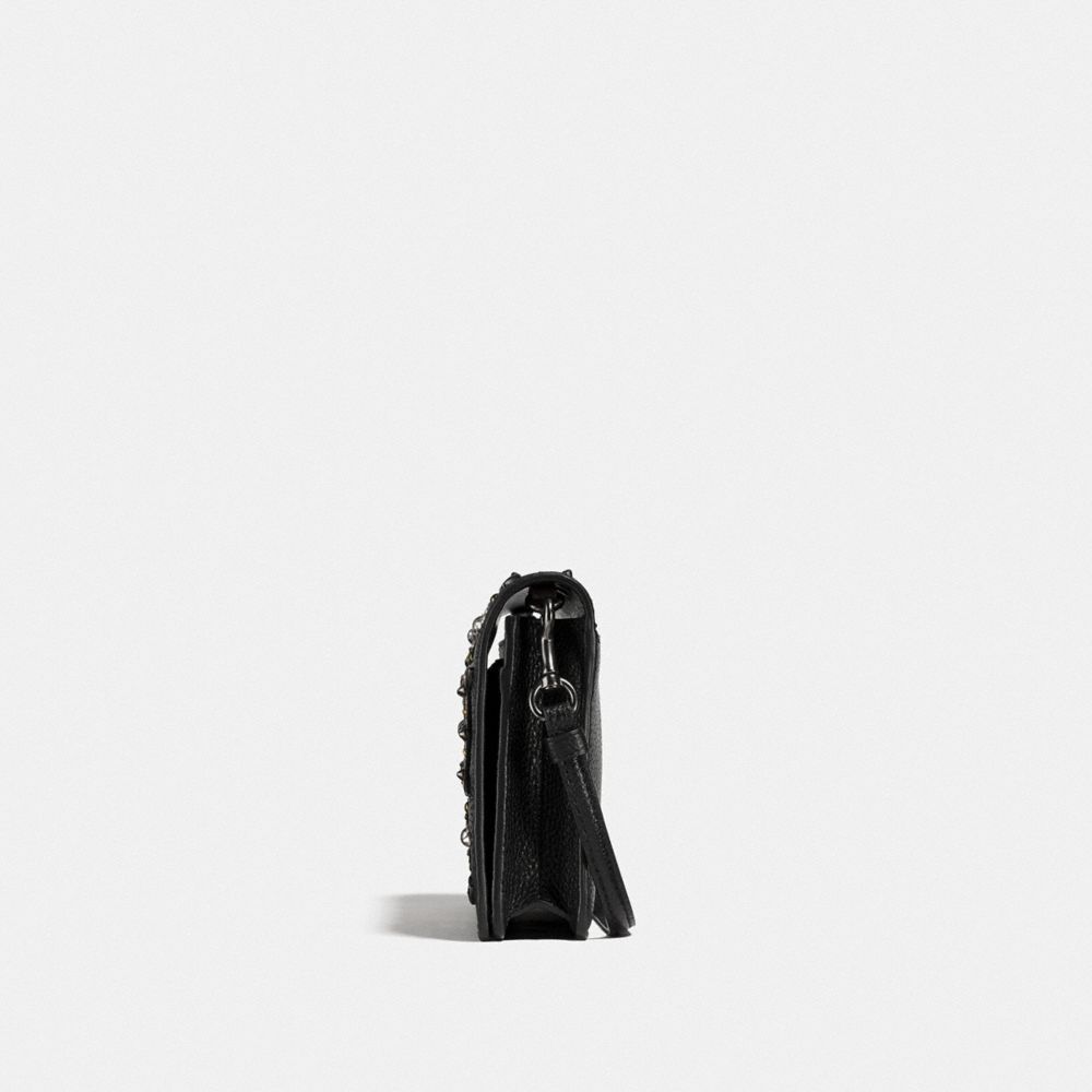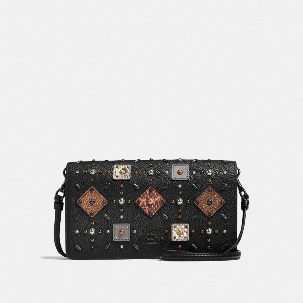 FOLDOVER CROSSBODY CLUTCH WITH PRAIRIE RIVETS AND SNAKESKIN DETAIL