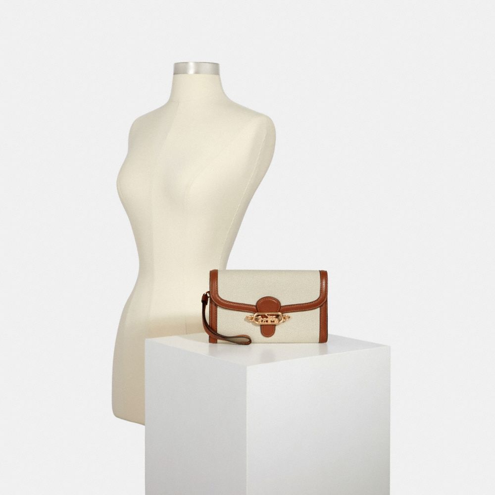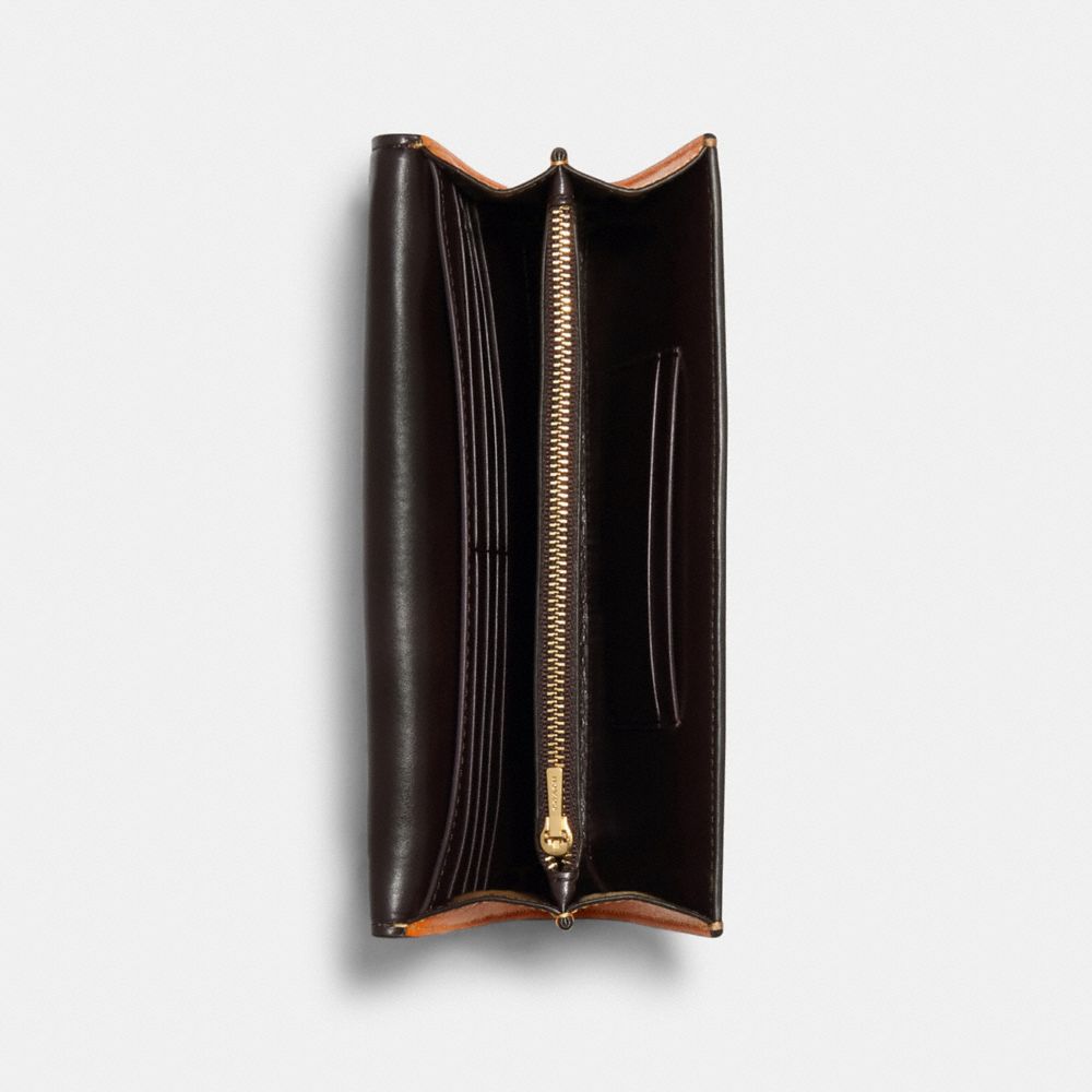 Canvas and refined pebble leather| Ten credit card slots| Full-length bill compartment| Inside zip compartment| Magnetic snap closure, fabric lining| Detachable wrist strap| Outside slip pocket| Detachable long strap with 22" drop for shoulder or crossbody wear| 8" (L) x 5" (H) x 3/4" (W)