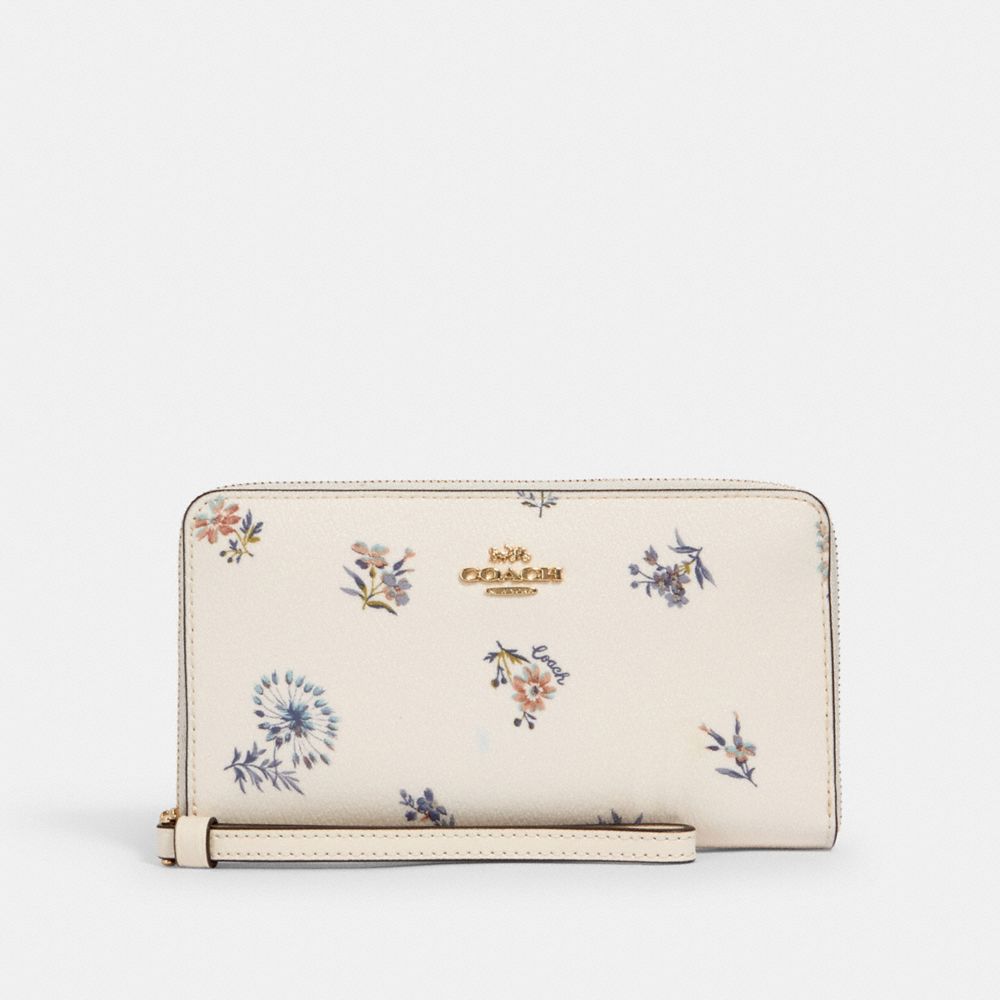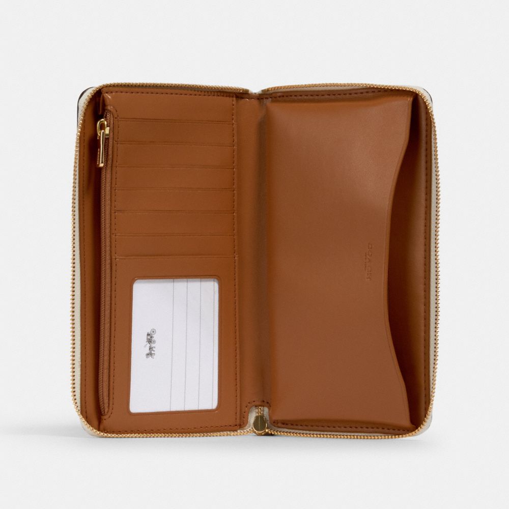 Printed coated canvas with smooth leather details| Six credit card slots| ID window| Zip coin pocket| Inside phone pocket| Zip-around closure| Wrist strap attached| 7 1/4" (L) x 4" (H) x 3/4" (W)