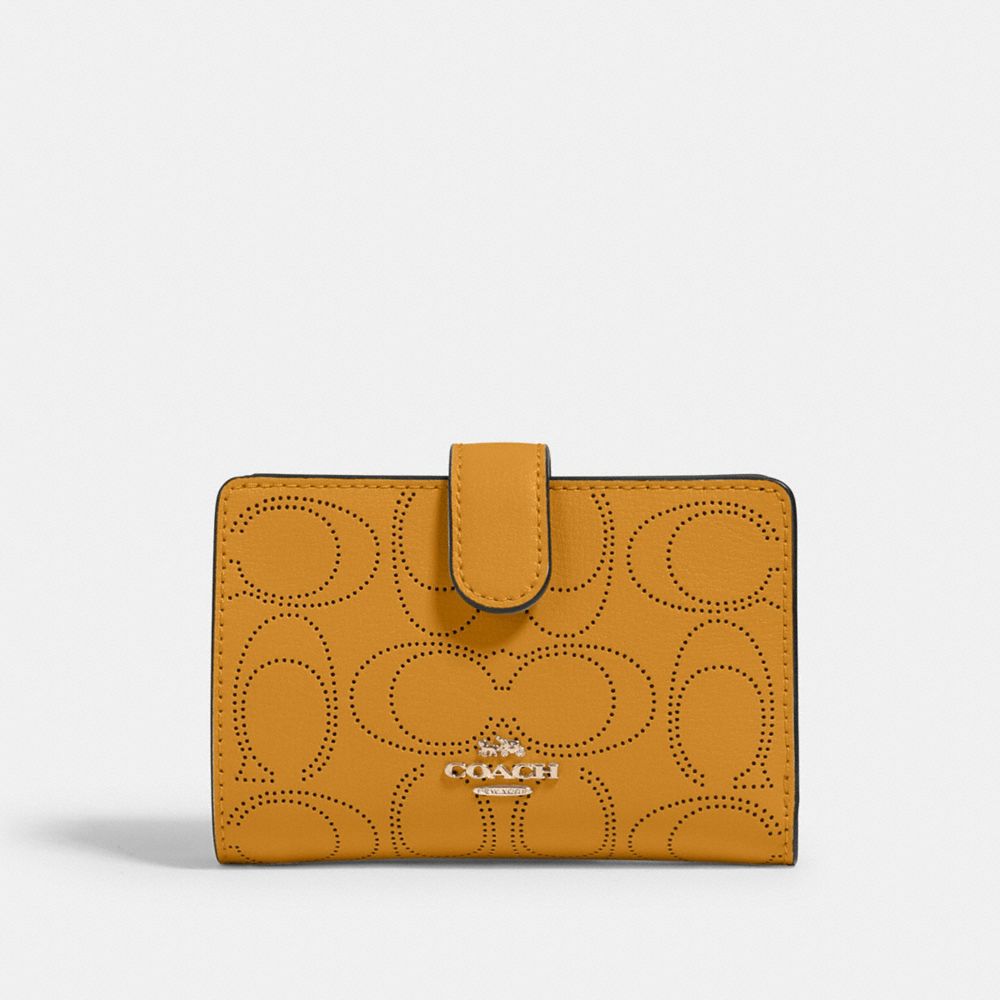 Signature perforated leather| Seven credit card slots| Bill compartment| ID window| Zip pocket| Snap closure| 5" (L) x 3 1/2" (H) x 1/2" (W)