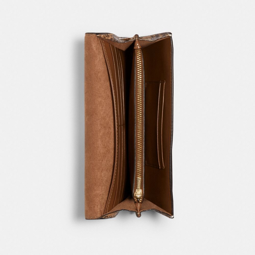 Signature coated canvas, smooth leather and snake-embossed leather| Ten credit card slots| Full-length bill compartment| Inside zip compartment| Magnetic snap closure, fabric lining| Detachable wrist strap| Outside slip pocket| Detachable long strap with 22" drop for shoulder or crossbody wear| 8" (L) x 5" (H) x 3/4" (W)