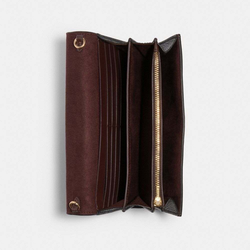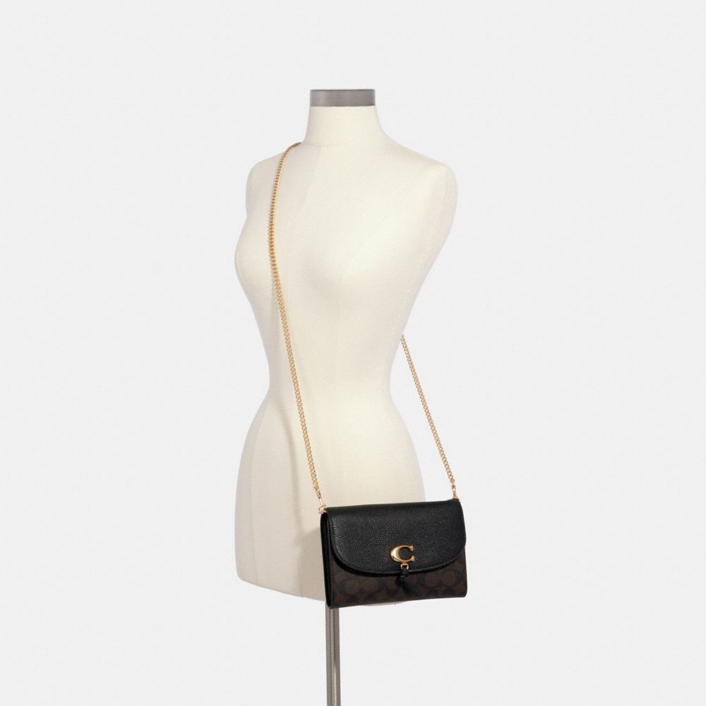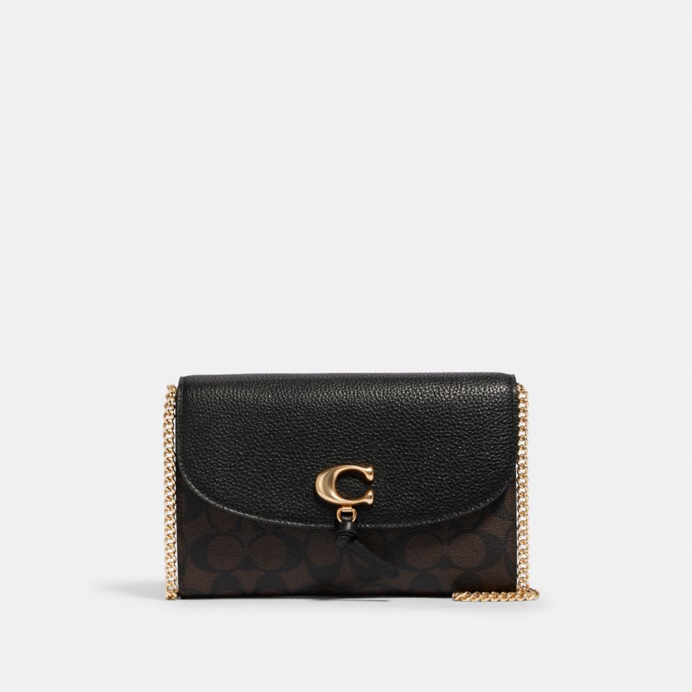 Signature coated canvas and refined pebble leather| Eight credit card slots| Inside zip and multifunction pockets| Snap closure, fabric lining| Outside slip pocket| Detachable chain strap with 23" drop for shoulder or crossbody wear| 8" (L) x 5 1/2" (H)