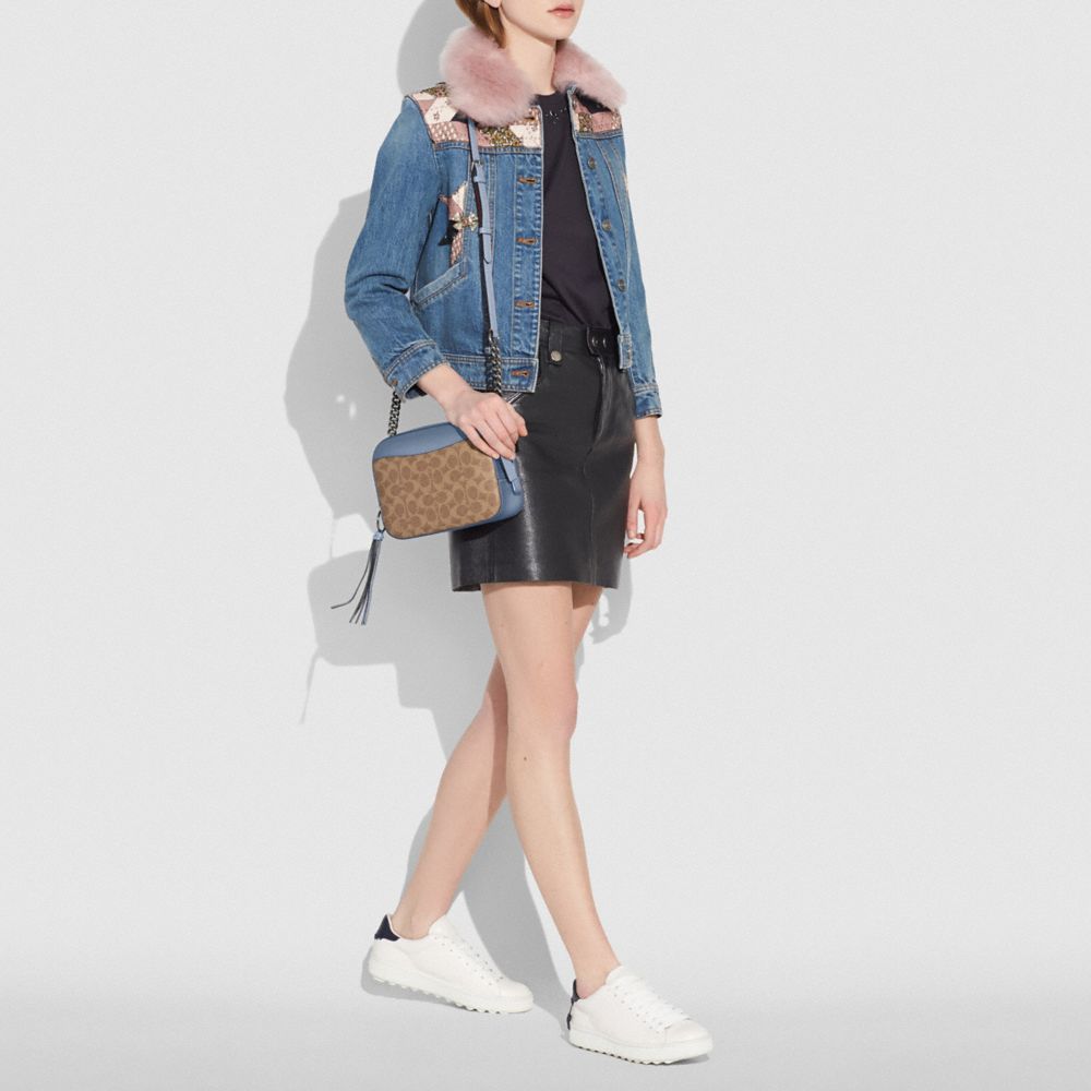 Signature coated canvas and refined calf leather| Inside zip and multifunction pockets| Zip closure, fabric lining| Outside open pocket| Adjustable strap with 21 1/2" drop for shoulder or crossbody wear| 8 1/4" (L) x 6 1/4" (H) x 3" (W)| Also available in other sizes
