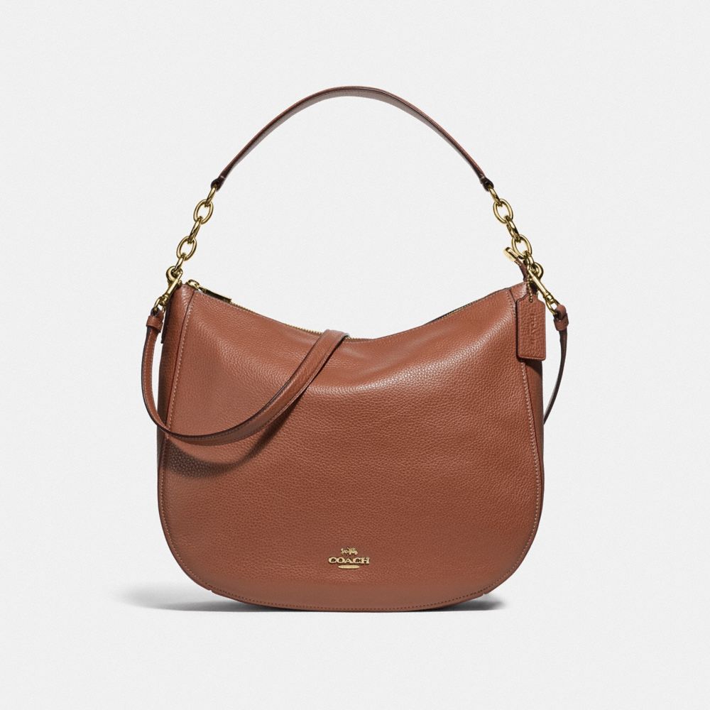 Refined pebble leather| Inside cell phone and multifunction pockets| Zip-top closure, fabric lining| Handle with 8 3/4" drop| Outside zip pocket| Detachable strap with 15 1/4" drop for shoulder wear| 13" (L) x 10 3/4" (H) x 4" (W)