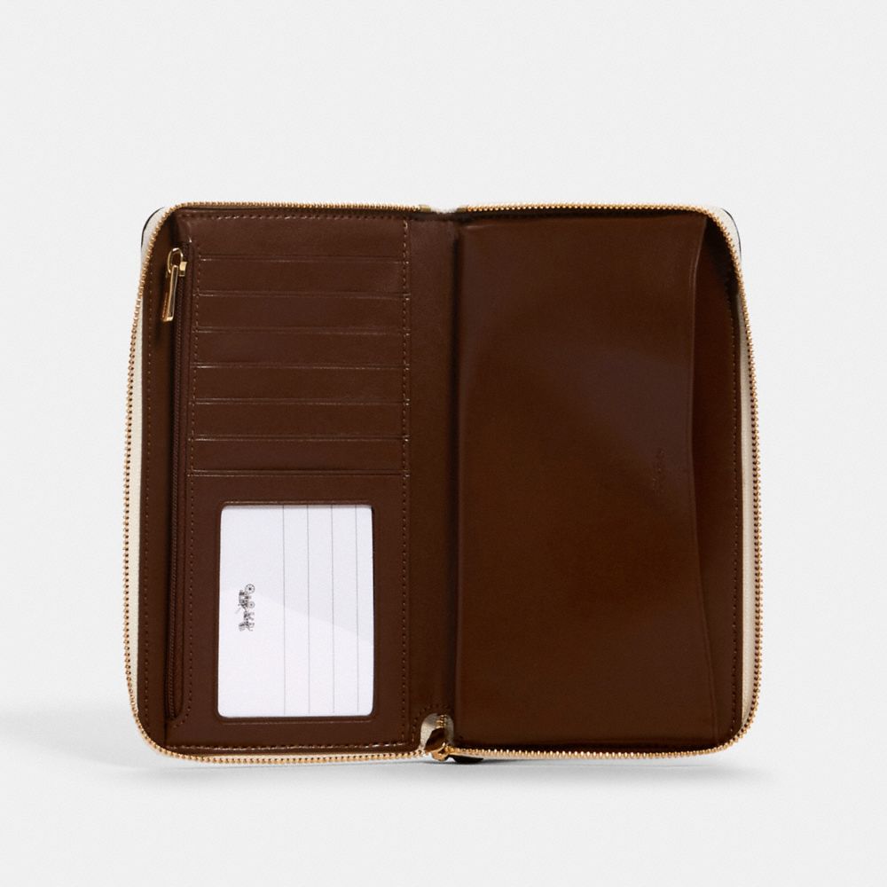Signature coated canvas with smooth leather details| Six credit card slots| ID window| Zip coin pocket| Inside phone pocket| Zip-around closure| Wrist strap attached| 7 1/4" (L) x 4" (H) x 3/4" (W)