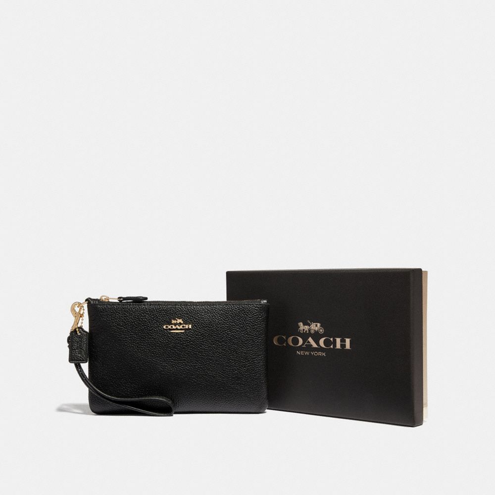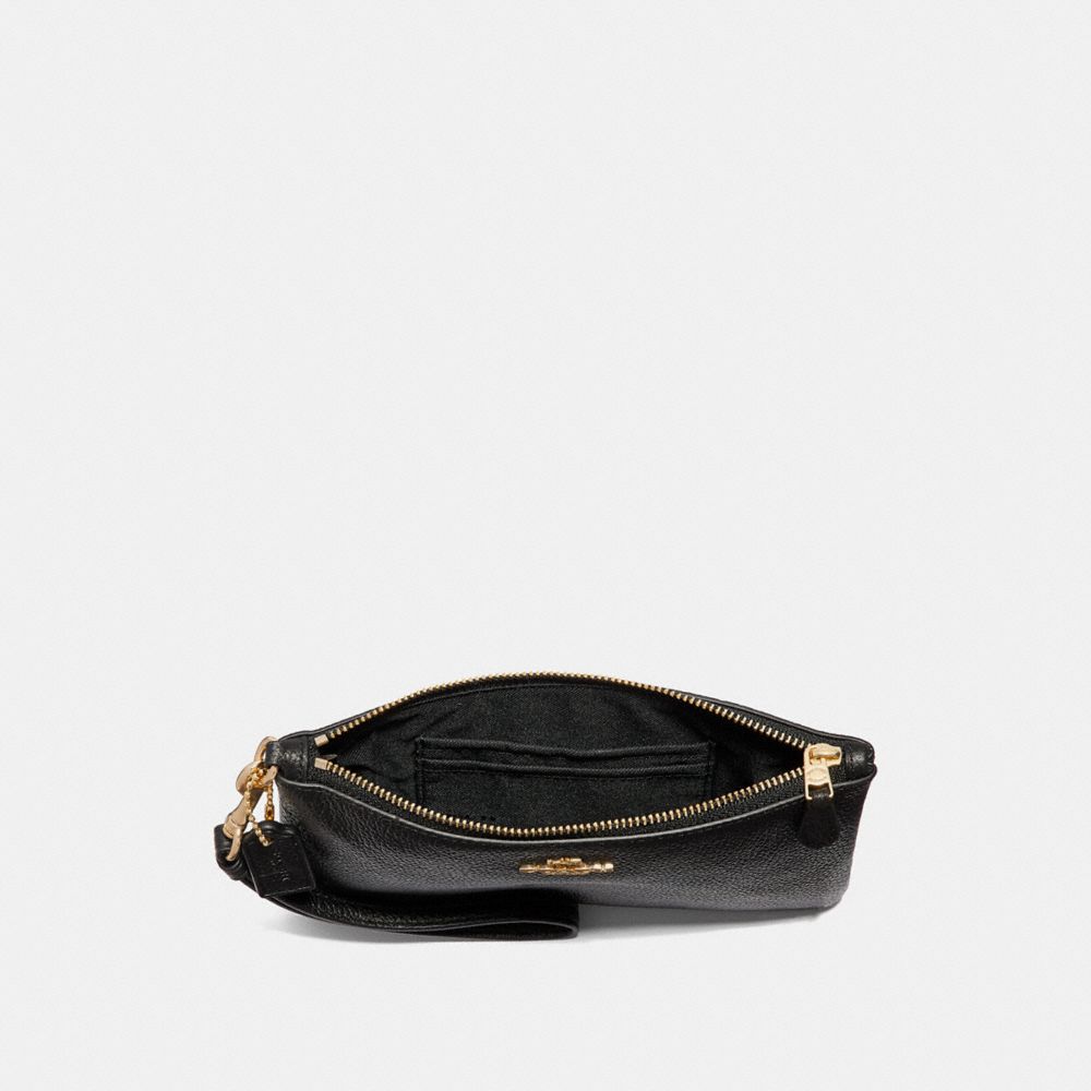 Polished pebble leather| Two credit card slots| Zip-top closure, fabric lining| Detachable wrist strap| 7 1/2" (L) x 4 3/4" (H)| Fits an iPhone or Android| Packaged in a Coach gift box