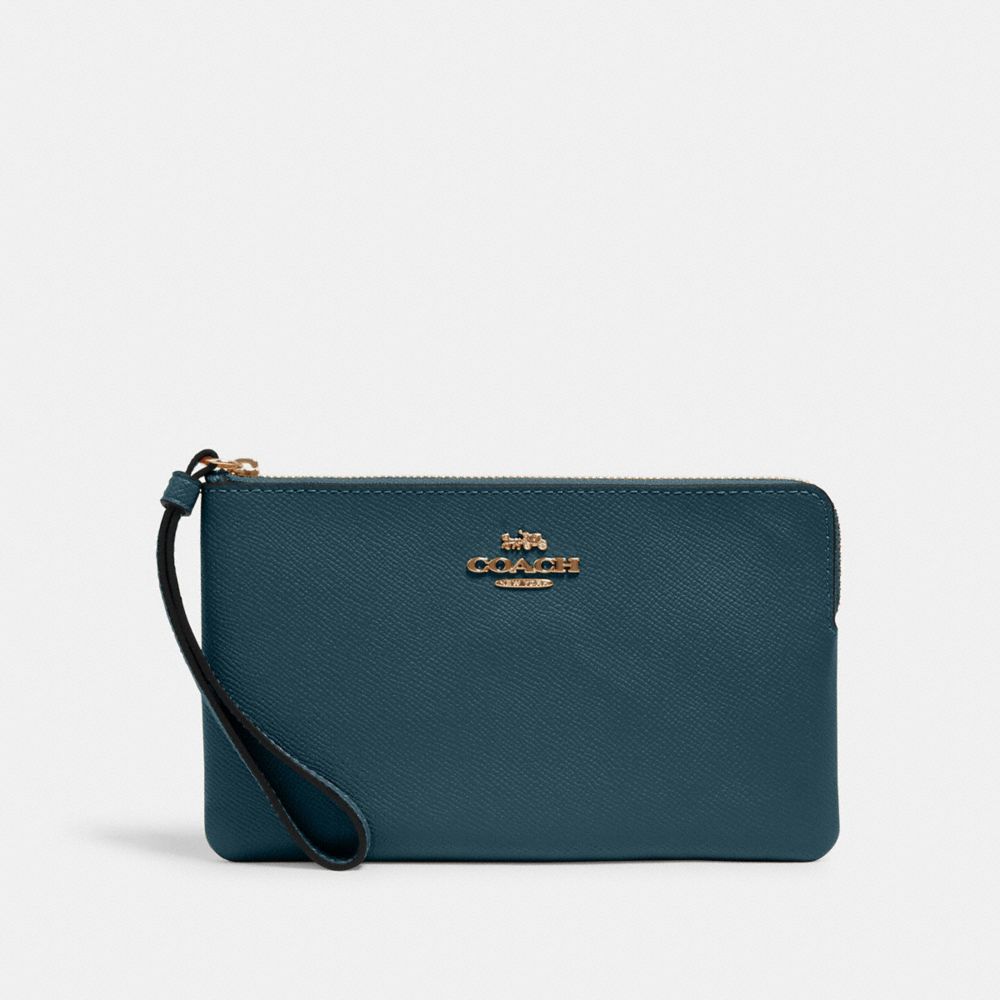 Crossgrain leather| Two credit card slots| Zip closure, fabric lining| Wrist strap attached| 7 3/4" (L) x 4 3/4" (H) x 1/2" (W)