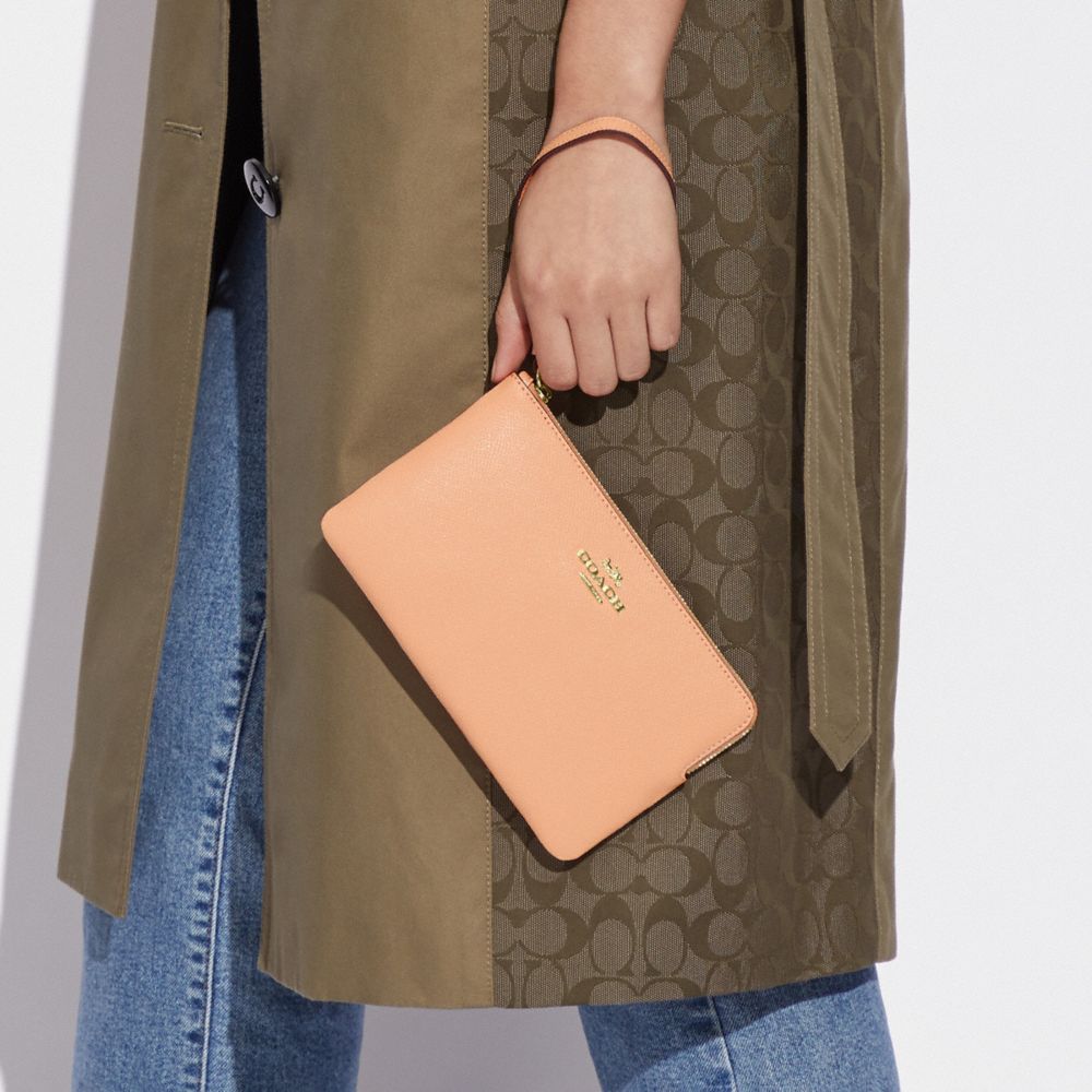 Crossgrain leather| Two credit card slots| Zip closure, fabric lining| Wrist strap attached| 7 3/4" (L) x 4 3/4" (H) x 1/2" (W)Style No. 3888