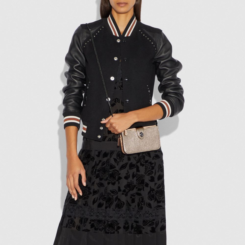 Metallic polished pebble leather| Credit card slot| Inside zip and open pockets| Turnlock closure, fabric lining| Detachable strap with 22" drop for shoulder or crossbody wear| 8 1/4" (L) x 5" (H) x 1" (W)