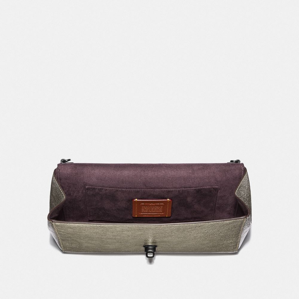 Metallic crinkle leather| Inside multifunction pocket| Turnlock closure, fabric lining| Outside slip pocket| Compatible with Coach interchangeable straps| 10 1/2" (L) x 6" (H)