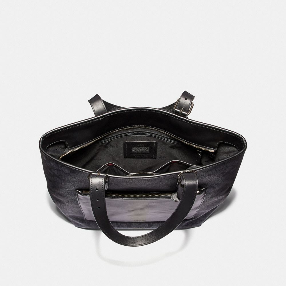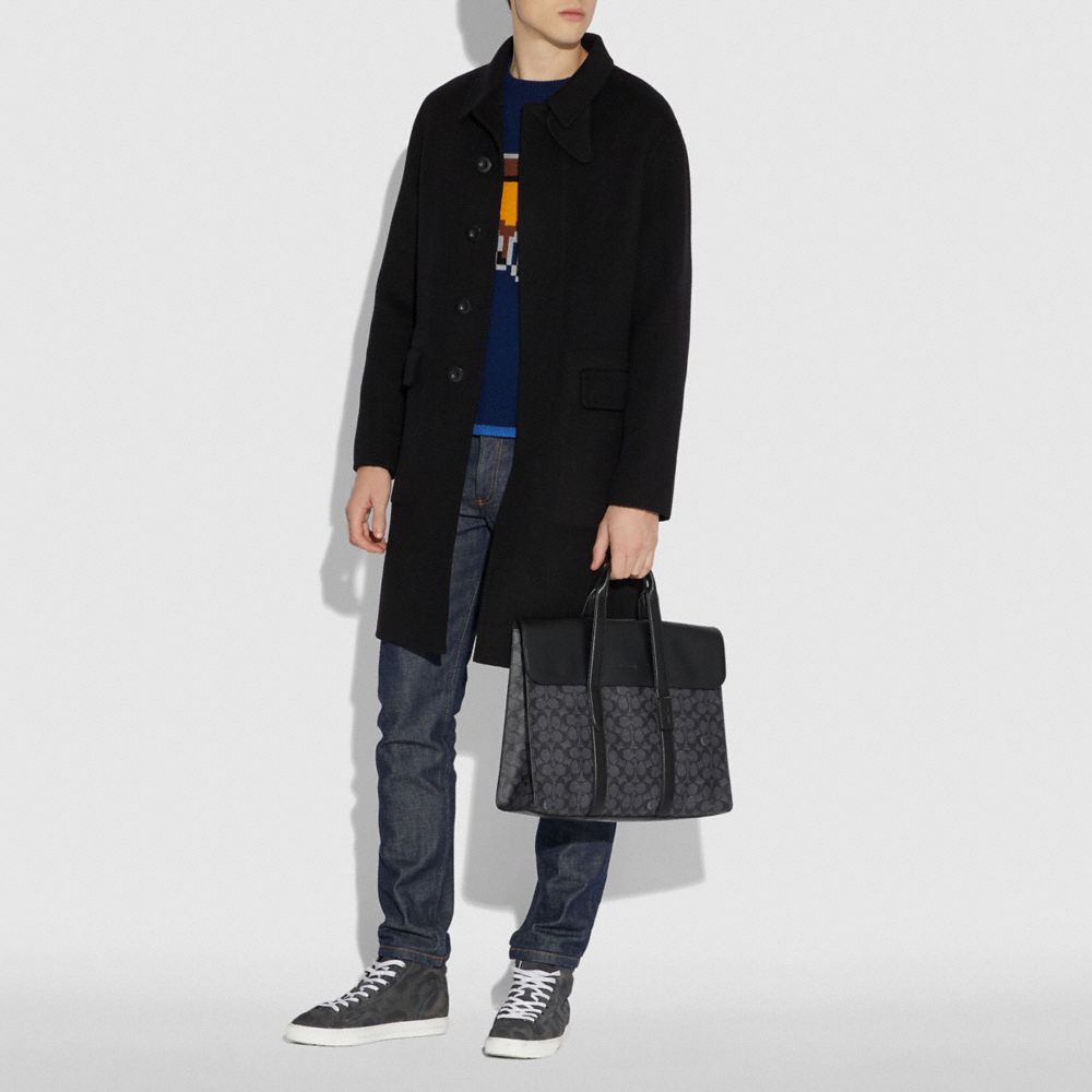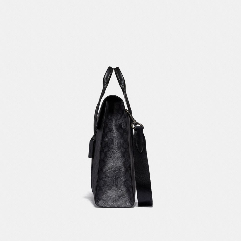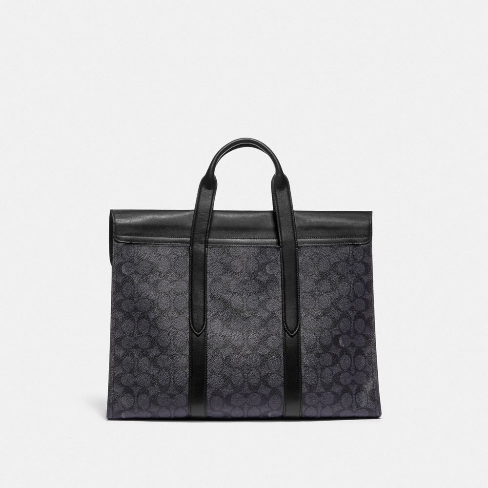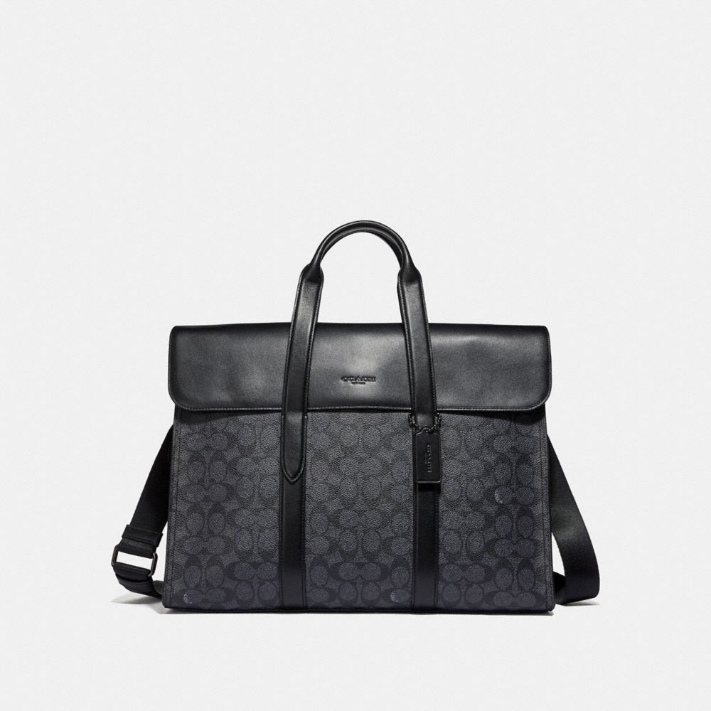 Signature coated canvas and refined calf leather| Inside zip and multifunction pockets| Inside sleeve with secure tab for a 15" laptop| Flap closure, fabric lining| Handles with 4" drop| Outside slip pocket with snap closure| Detachable strap with 25" drop for crossbody wear| 15 3/4" (L) x 11 1/4" (H) x 3 1/2" (W)Style No. 39775