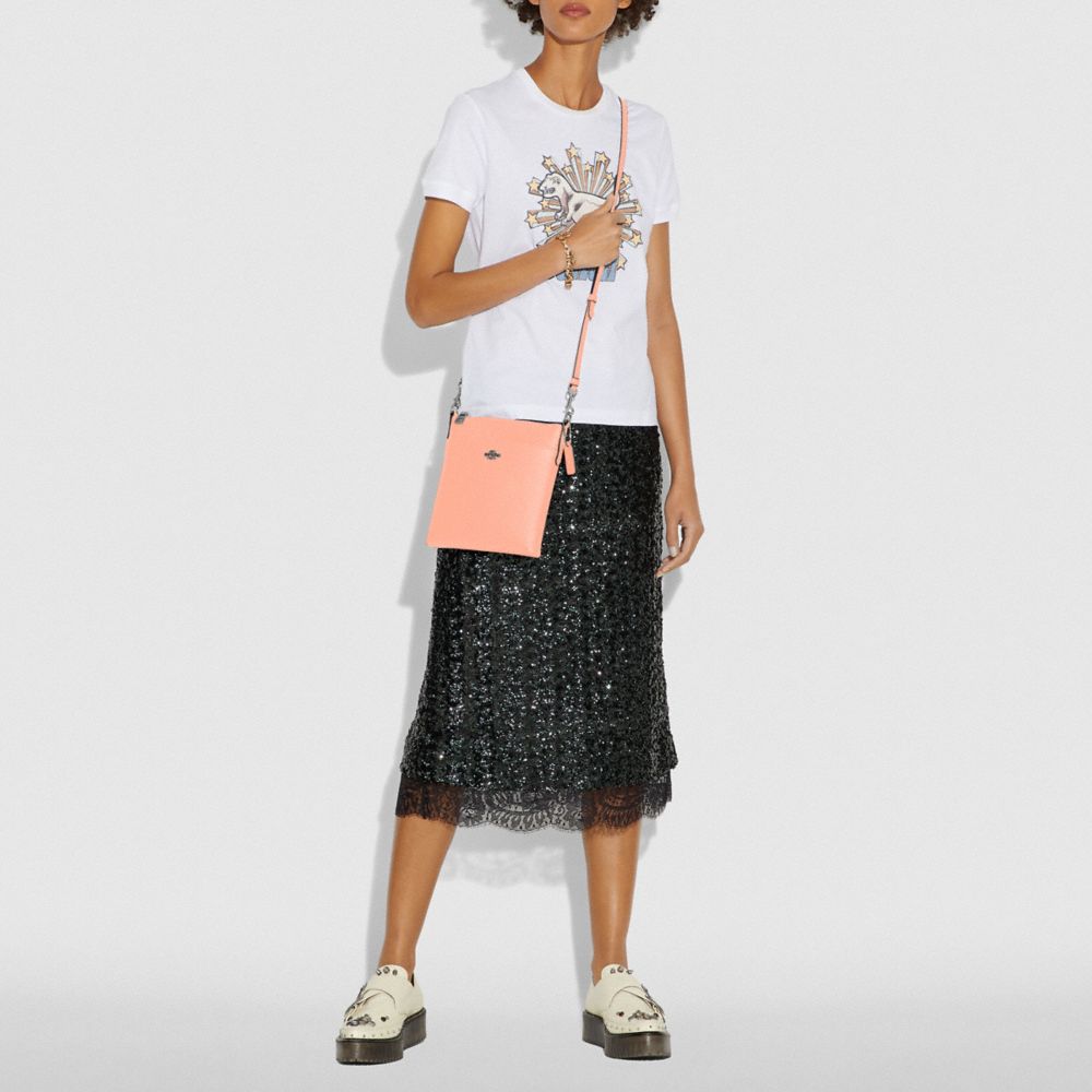 Crossgrain leather| Inside open pocket| Zip-top closure, fabric lining| Outside open pocket| Detachable strap with 23" drop for shoulder or crossbody wear| 7 3/4" (L) x 8 1/4" (H) x 1" (W)Style No. 41320