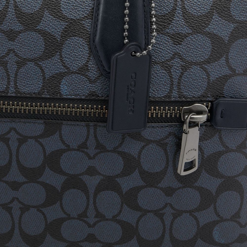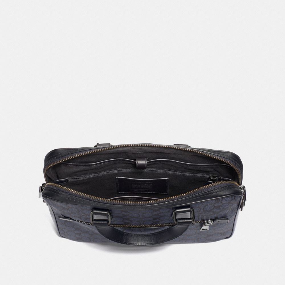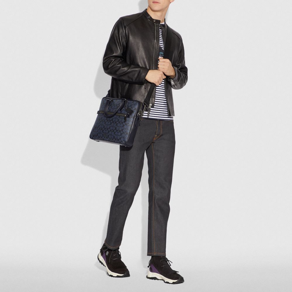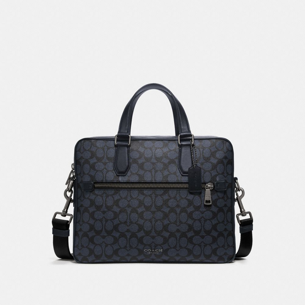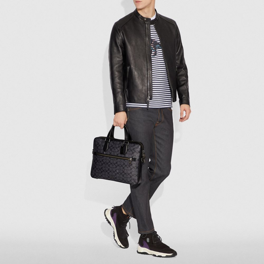Signature coated canvas and refined calf leather| Inside zip, cell phone and multifunction pockets| Inside sleeve with secure tab for a 13" laptop| Zip closure, fabric lining| Handles with 4 1/4" drop | Outside zip pocket| Detachable strap with 25" drop for shoulder or crossbody wear| 14 1/4" (L) x 11" (H) x 2" (W)