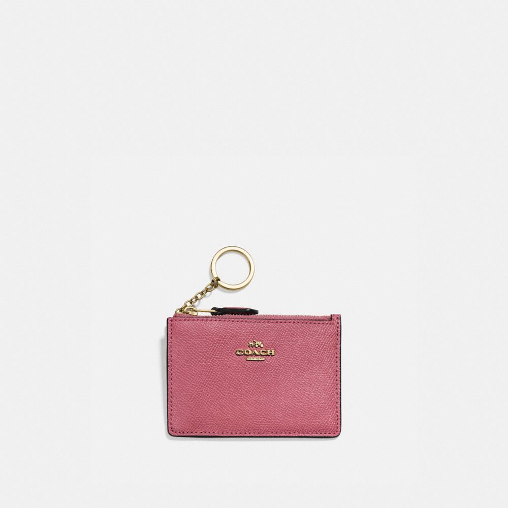 Crossgrain leather| Credit card slot and ID window| Zip-top closure, fabric lining| Attached split key ring| 4 1/4" (L) x 3" (H)