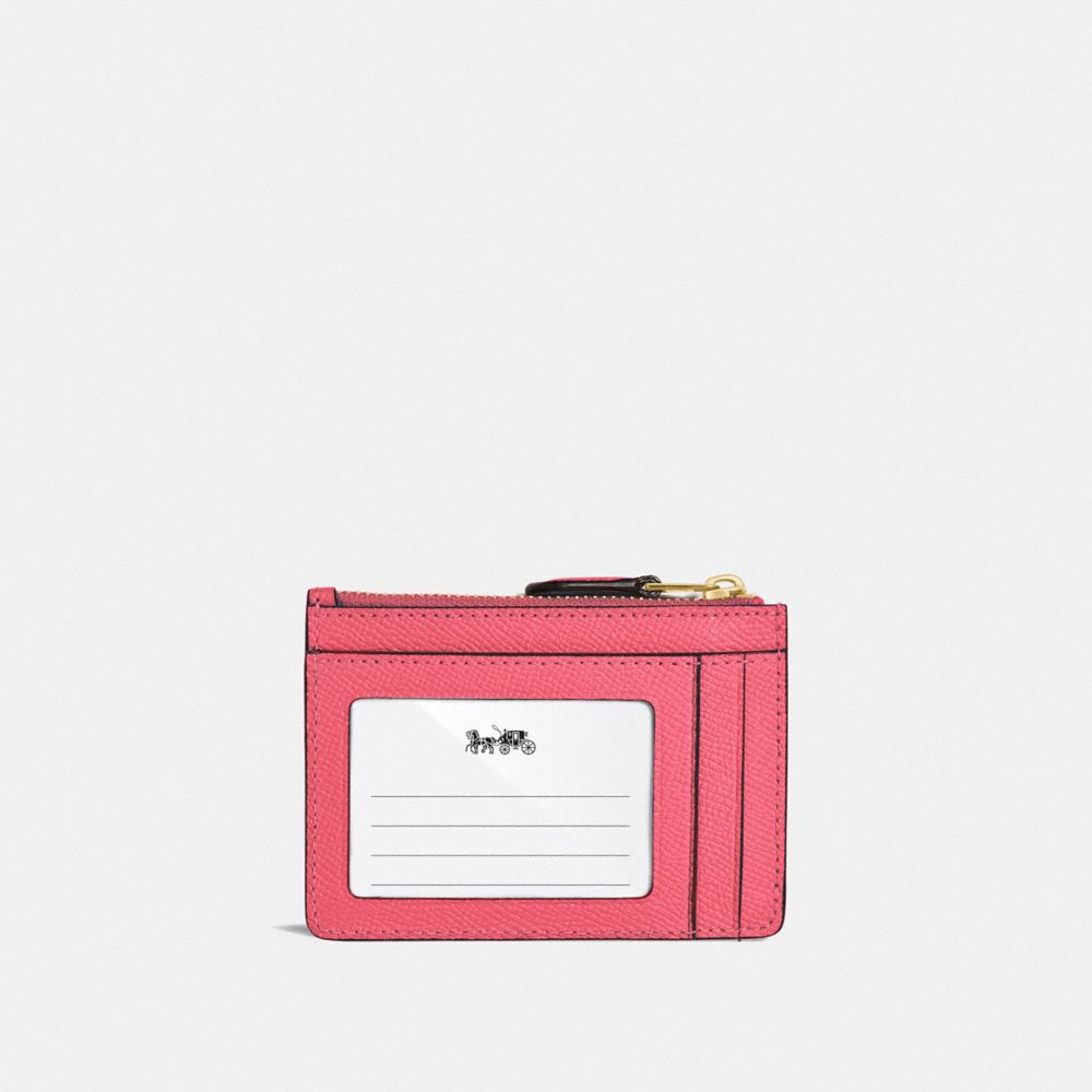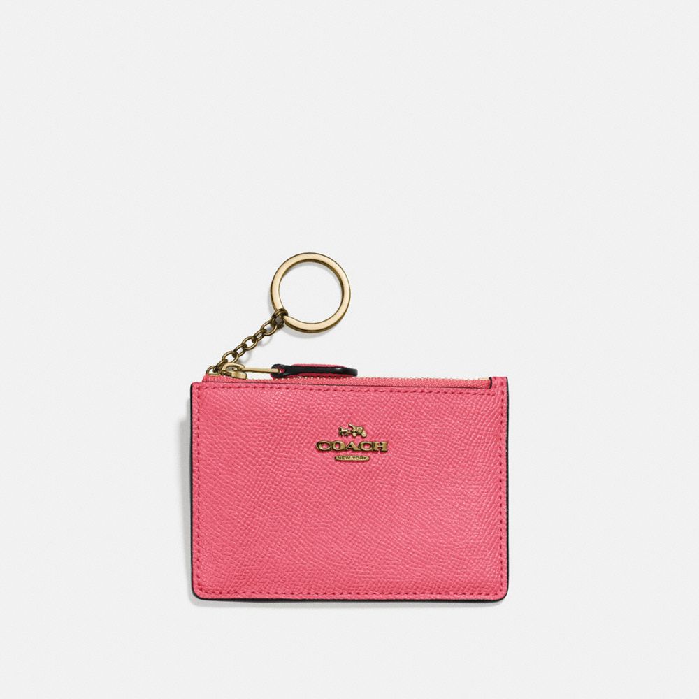 Crossgrain leather| Credit card slot and ID window| Zip-top closure, fabric lining| Attached split key ring| 4 1/4" (L) x 3" (H)Style No. 57841