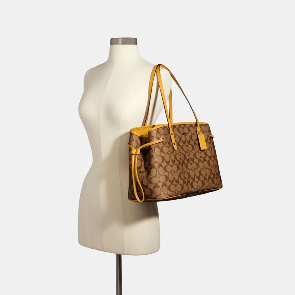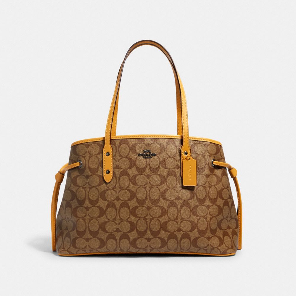Signature coated canvas| Inside zip, cell phone and multifunction pockets| Center zip compartment| Dogleash clip closure, fabric lining| Handles with 8 1/2" drop| 14 1/4" (L) x 9 3/4" (H) x 6 1/4" (W)