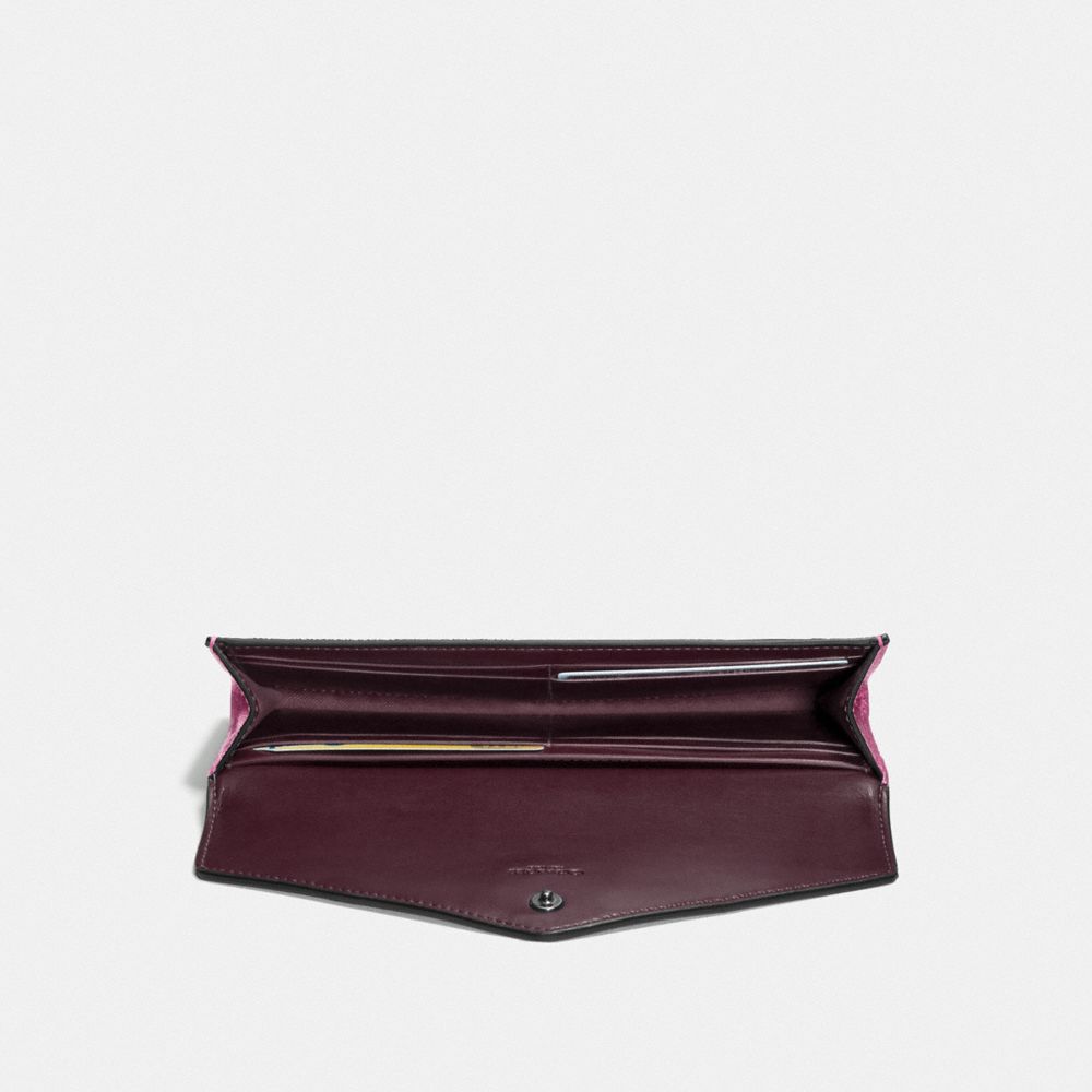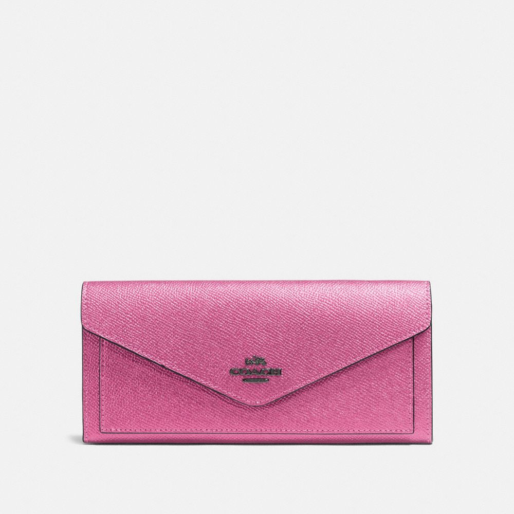 Metallic crossgrain leather| Eight credit card slots| Full-length bill compartment| Snap closure| Outside zip coin pocket| 7 3/4" (L) x 3 1/2" (H)