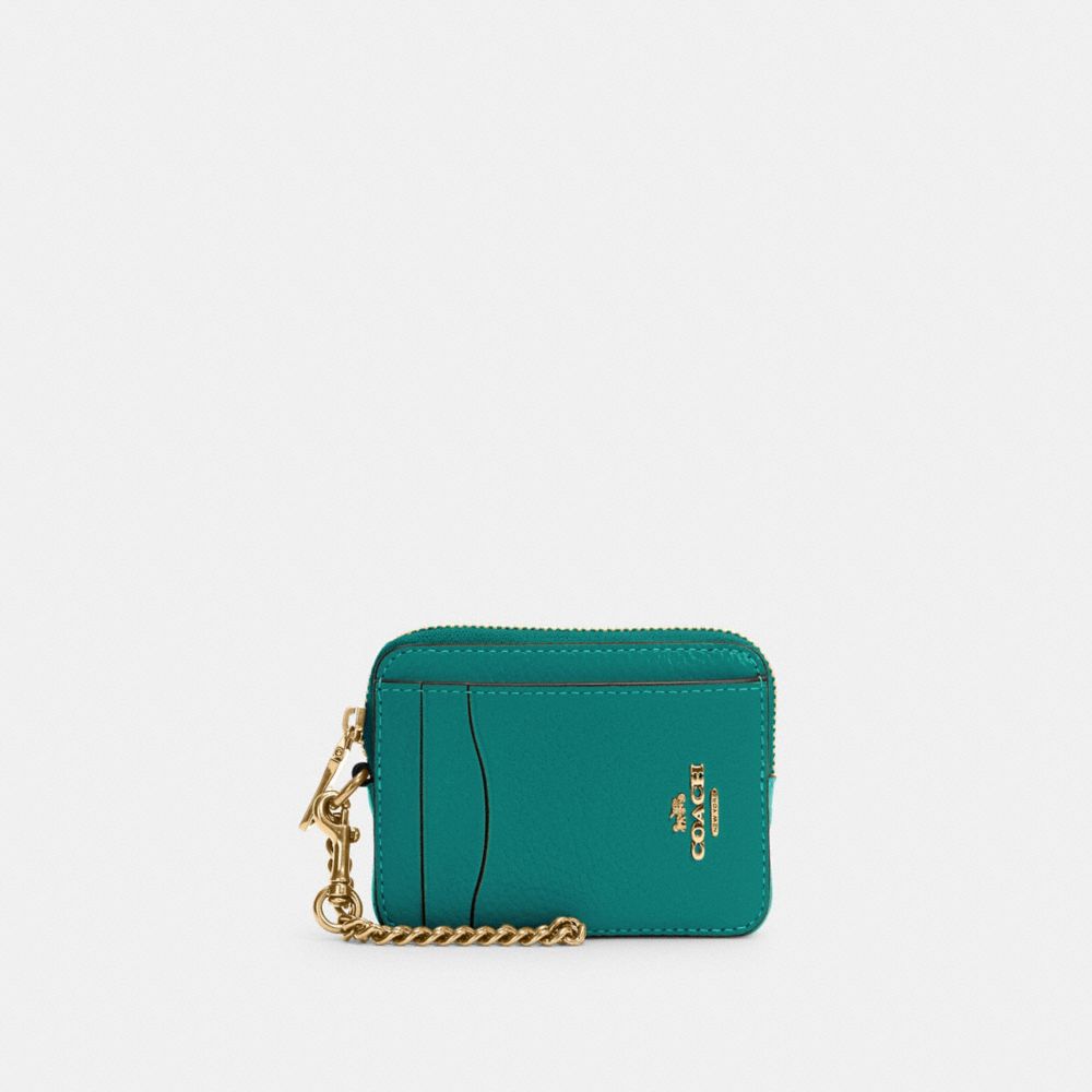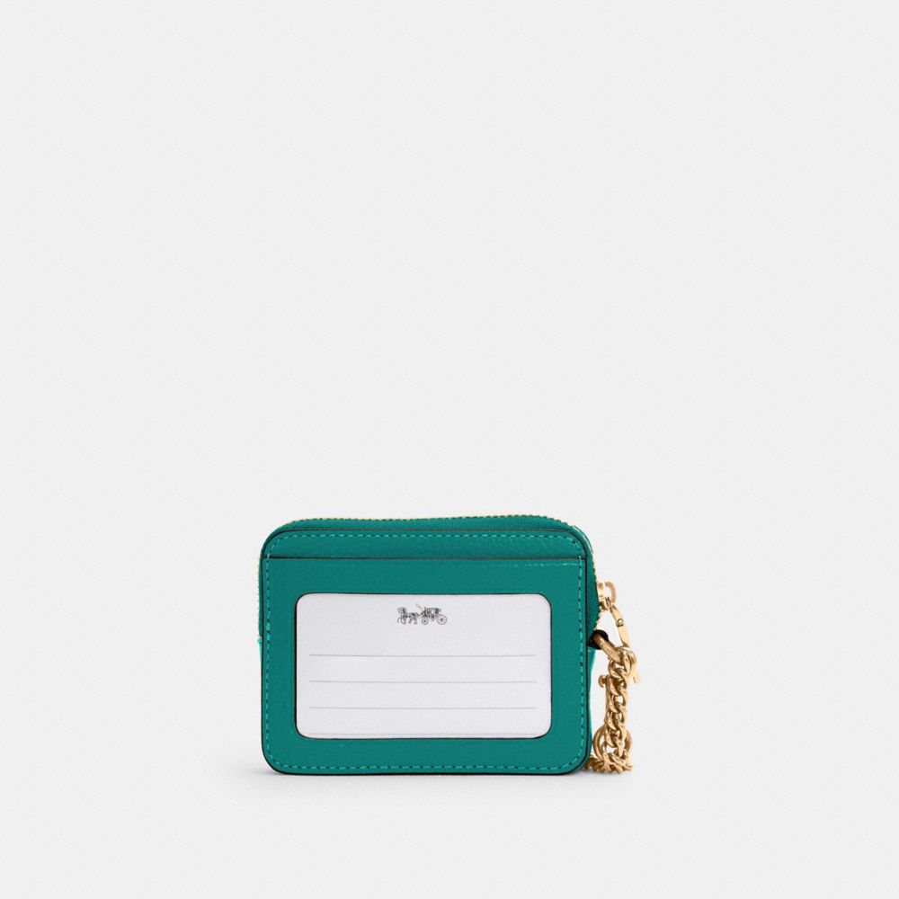 Refined pebble leather| Two credit card slots| ID window| Open pockets| Zip compartment| Chain wrist strap with dogleash clip attached| 3" (L) x 4 1/4" (H) x 3/4" (W)