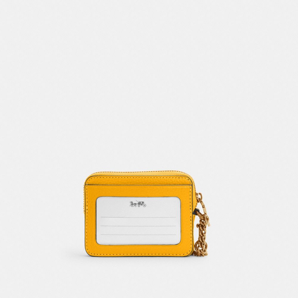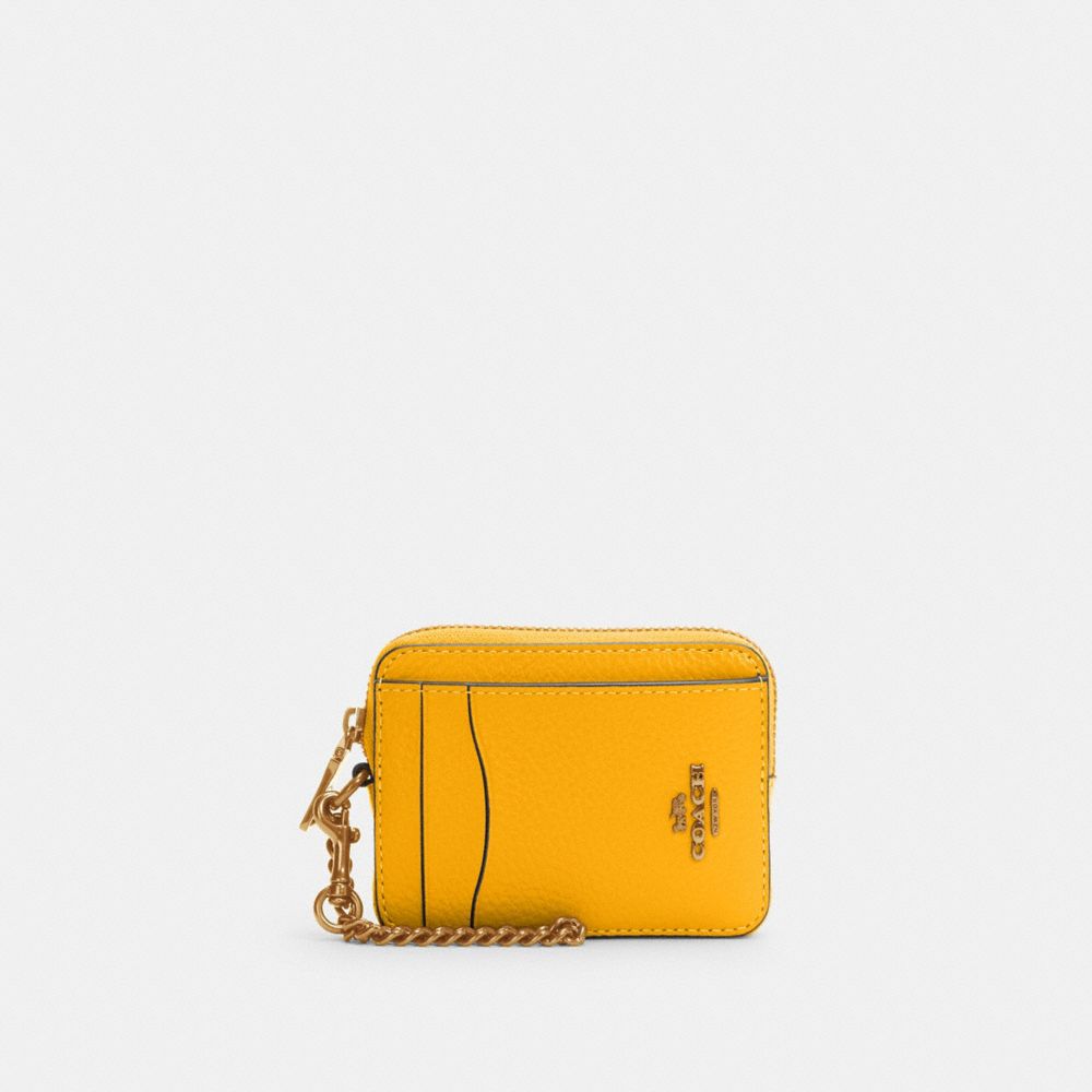 Refined pebble leather| Two credit card slots| ID window| Open pockets| Zip compartment| Chain wrist strap with dogleash clip attached| 3" (L) x 4 1/4" (H) x 3/4" (W)