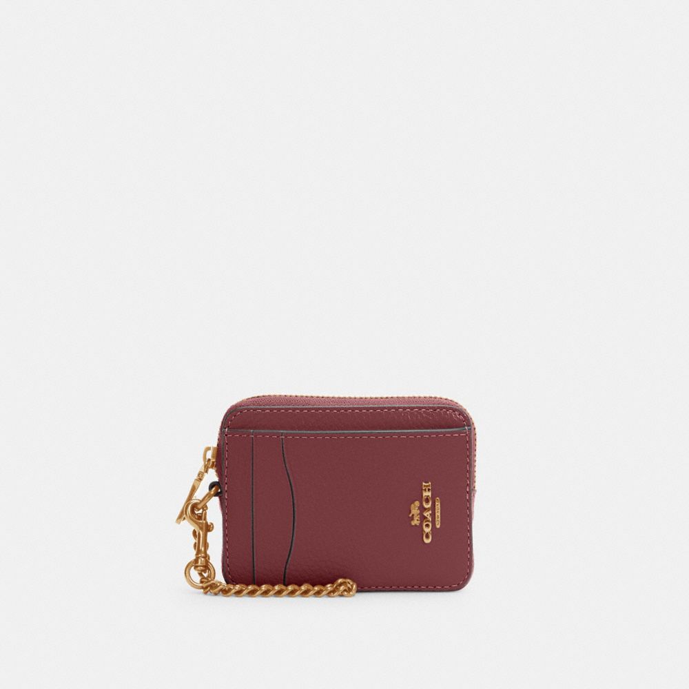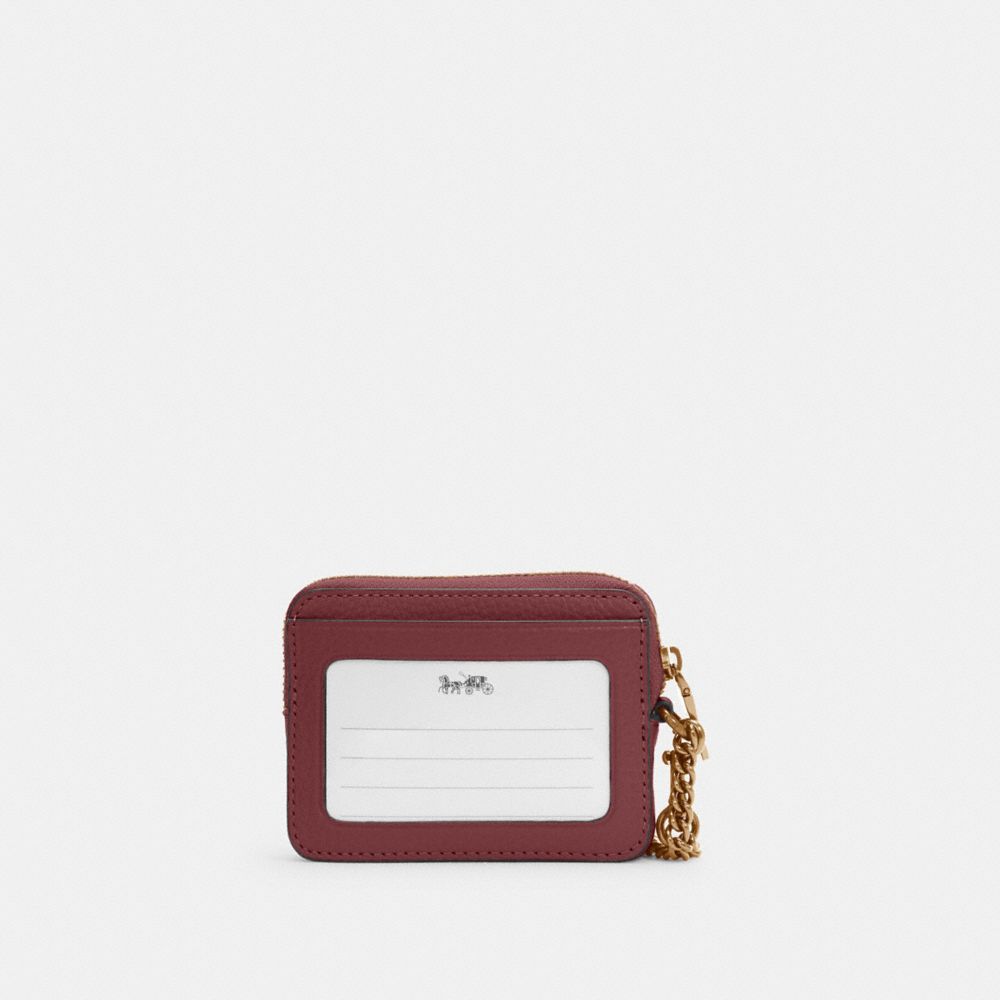 Refined pebble leather| Two credit card slots| ID window| Open pockets| Zip compartment| Chain wrist strap with dogleash clip attached| 3" (L) x 4 1/4" (H) x 3/4" (W)