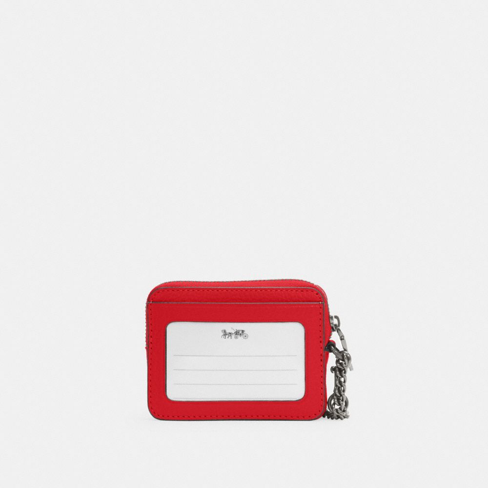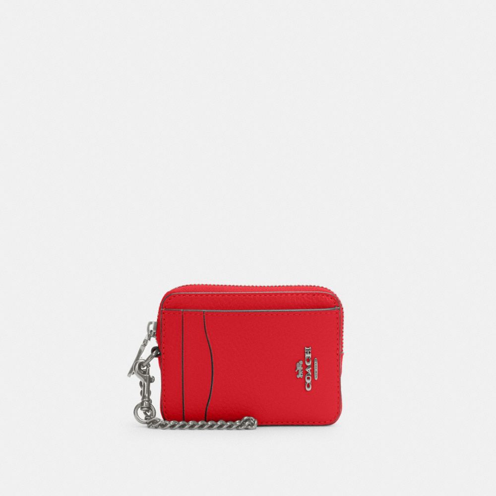Refined pebble leather| Two credit card slots| ID window| Open pockets| Zip compartment| Chain wrist strap with dogleash clip attached| 3" (L) x 4 1/4" (H) x 3/4" (W)