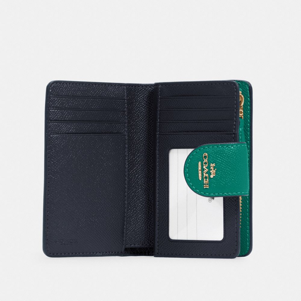 Crossgrain leather| Seven credit card slots| Bill compartment| ID window| Snap closure| Zip coin pocket| 5" (L) x 3 1/2" (H) x 1/2" (W)