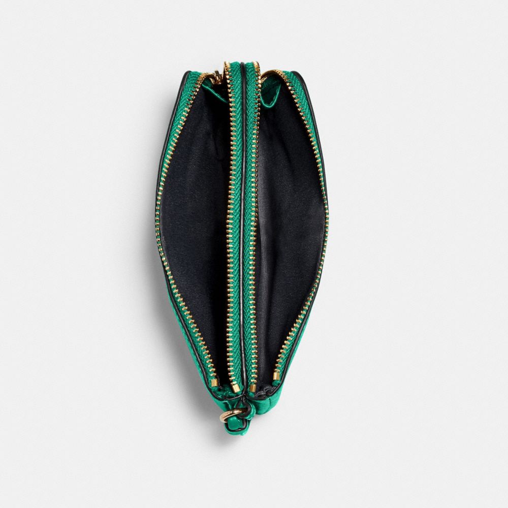 Refined pebble leather| Two credit card slots| Double zip closure, fabric lining| Wrist strap attached| 6 1/2" (L) x 3 3/4" (H) x 1 3/4" (W)