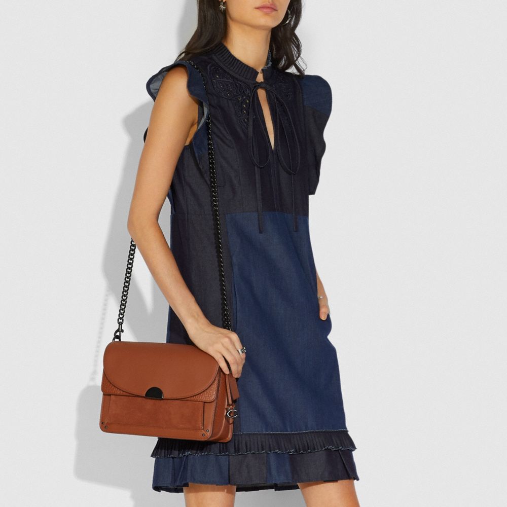 Glovetanned leather, buffalo-embossed leather and suede| Inside zip and open pockets| Snap closure, leather lining| Outside open pocket| Two detachable straps with 23" drop for shoulder and crossbody wear| Instantly change the look of your bag with an interchangeable strap.| 10 1/4" (L) x 7 1/2" (H) x 3 1/2" (W)