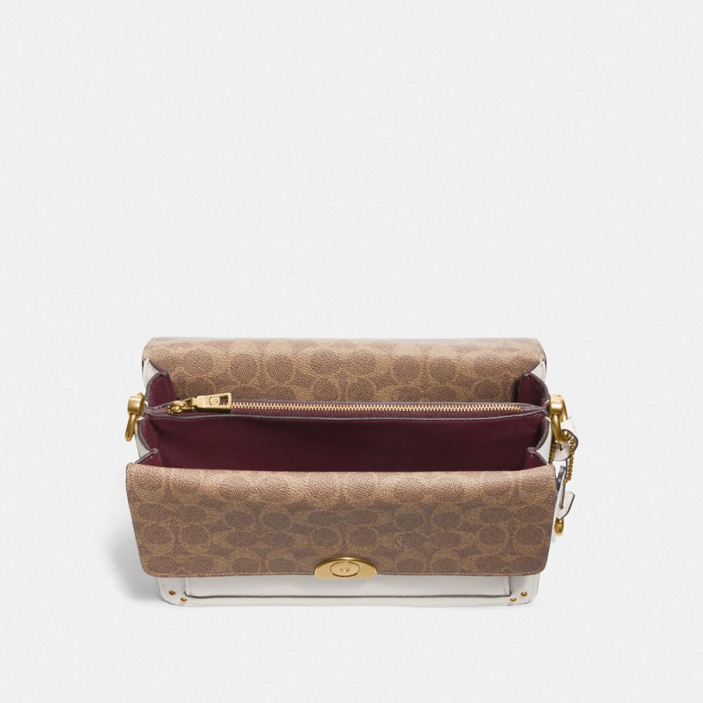 Glovetanned leather and Signature coated canvas| Inside zip and open pockets| Snap closure, leather lining| Outside open pocket| Two detachable straps with 23" drop for shoulder and crossbody wear| Instantly change the look of your bag with an interchangeable strap.| 10 1/4" (L) x 7 1/2" (H) x 3 1/2" (W)