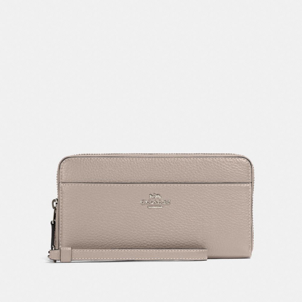 Polished pebble leather| 12 credit card slots| Full-length bill compartments| Zip coin pocket| Zip-around closure| Outside open pocket| Wrist strap attached| 7 1/2" (L) x 4" (H) x 3/4" (W)| Fits all phone sizes up to an iPhone X and Samsung S7 Edge