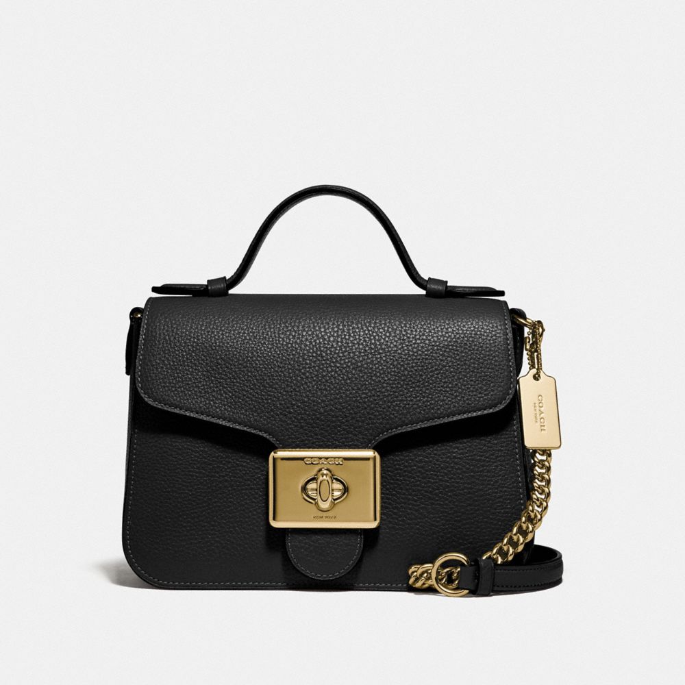 Refined pebble leather| Inside multifunction pockets| Turnlock closure, fabric lining| Handle with 2" drop| Outside slip pocket| Detachable strap with 21 3/4" drop for shoulder or crossbody wear| 9" (L) x 6 1/4" (H) x 3 1/4" (W)