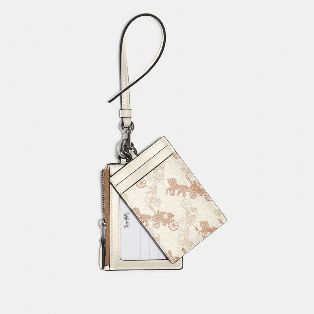 Zip ID case:| Printed coated canvas and smooth leather| ID window| Zip-top closure, fabric lining| 4" (L) x 2 3/4" (H)| Card case:| Printed coated canvas and smooth leather| Four credit card slots| 2 3/4" (L) x 4" (H)| Detachable lanyard with 6" drop