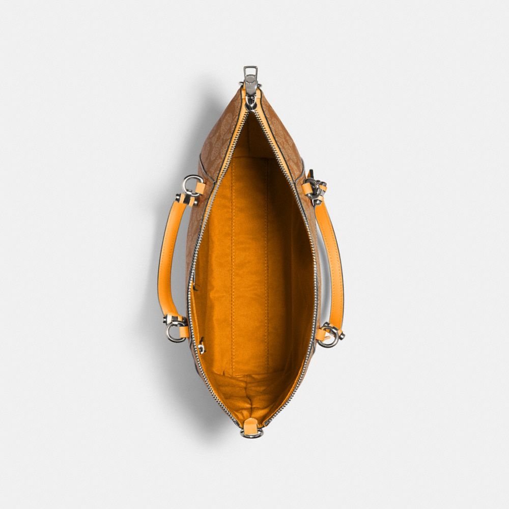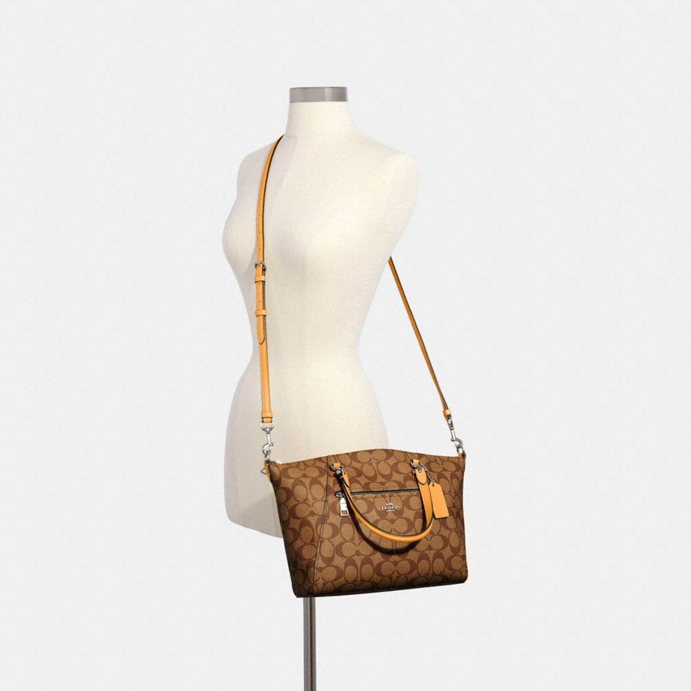 Signature coated canvas with smooth leather details| Inside zip pocket| Zip-top closure, fabric lining| Handles with 5" drop| Outside zip pocket| Detachable strap with 21" drop for shoulder or crossbody wear| 10 1/2" (L) x 8 3/4" (H) x 3 3/4" (W)